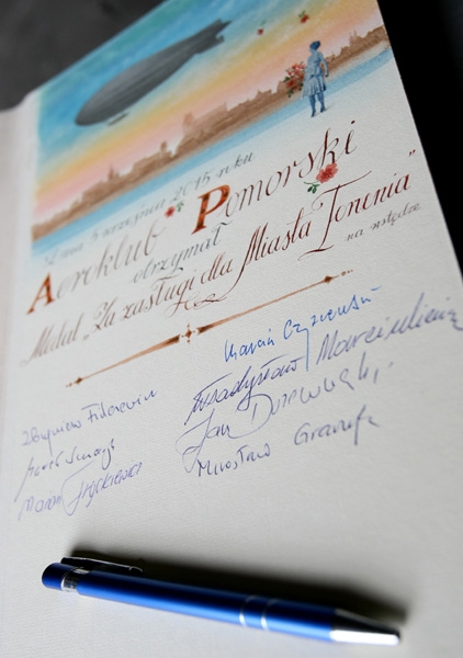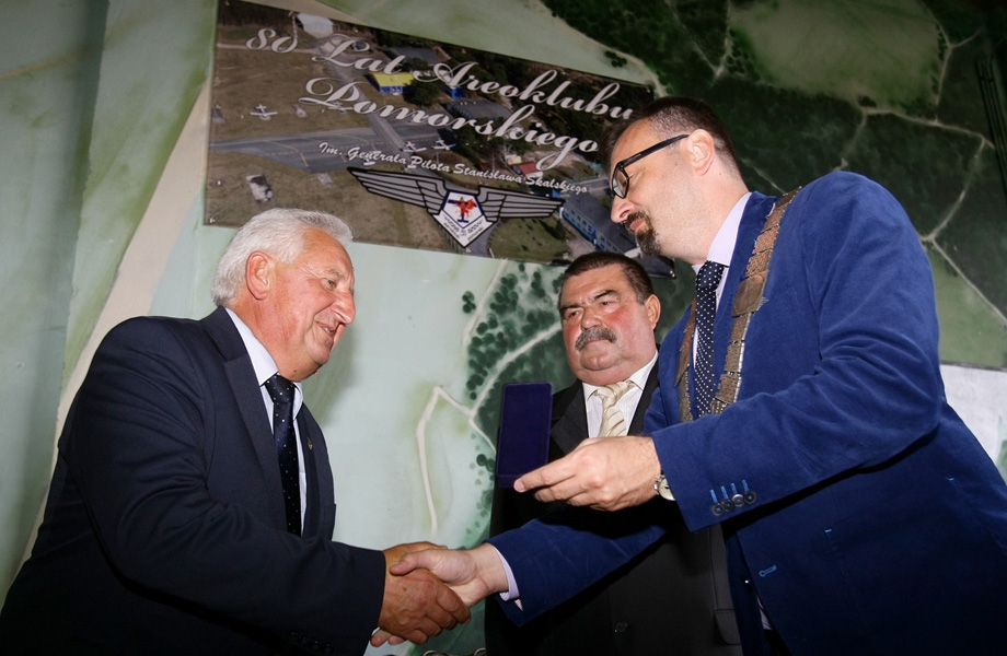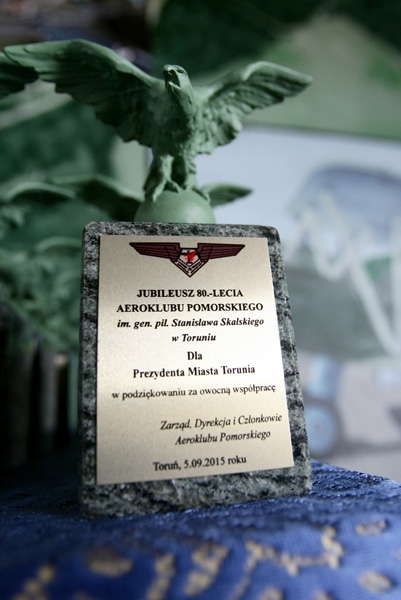 5 września 2015 r. Aeroklub Pomorski został odznaczony Medalem za Zasługi dla Miasta Torunia na wstędze. Odznaczenie zostało wręczone przez przewodniczącego Rady Miasta Torunia Marcina Czyżniewskiego podczas uroczystego spotkania z okazji 80-lecia Aeroklubu Pomorskiego. fot. Adam Zakrzewski
