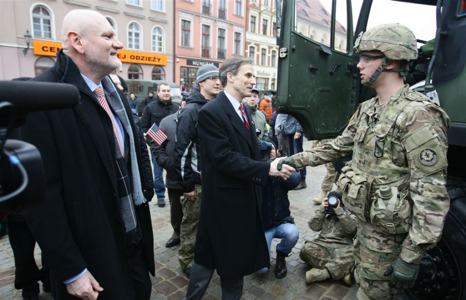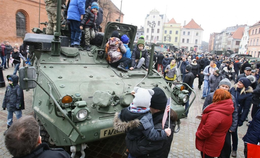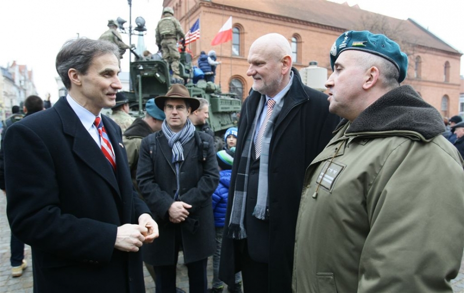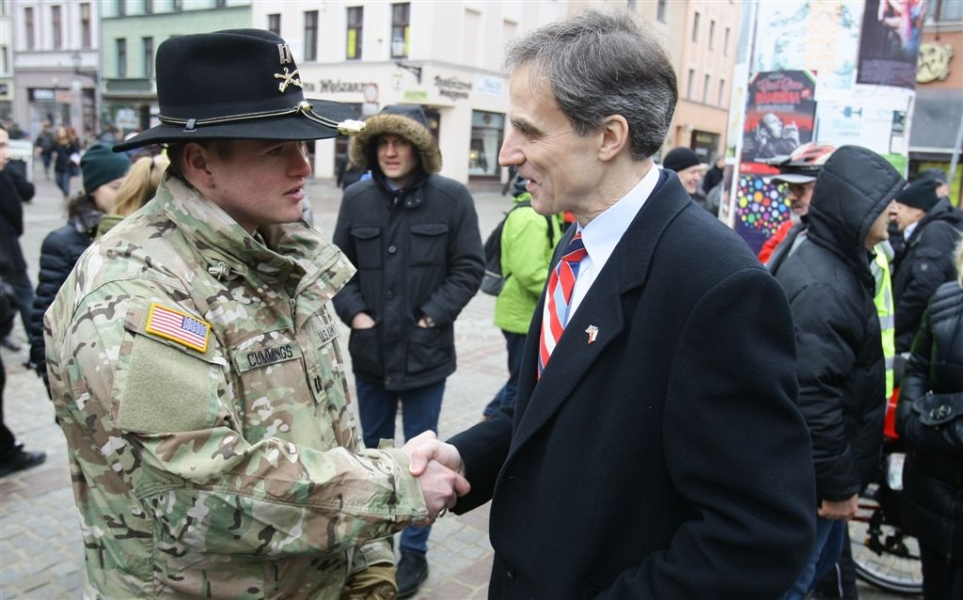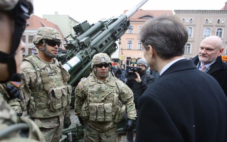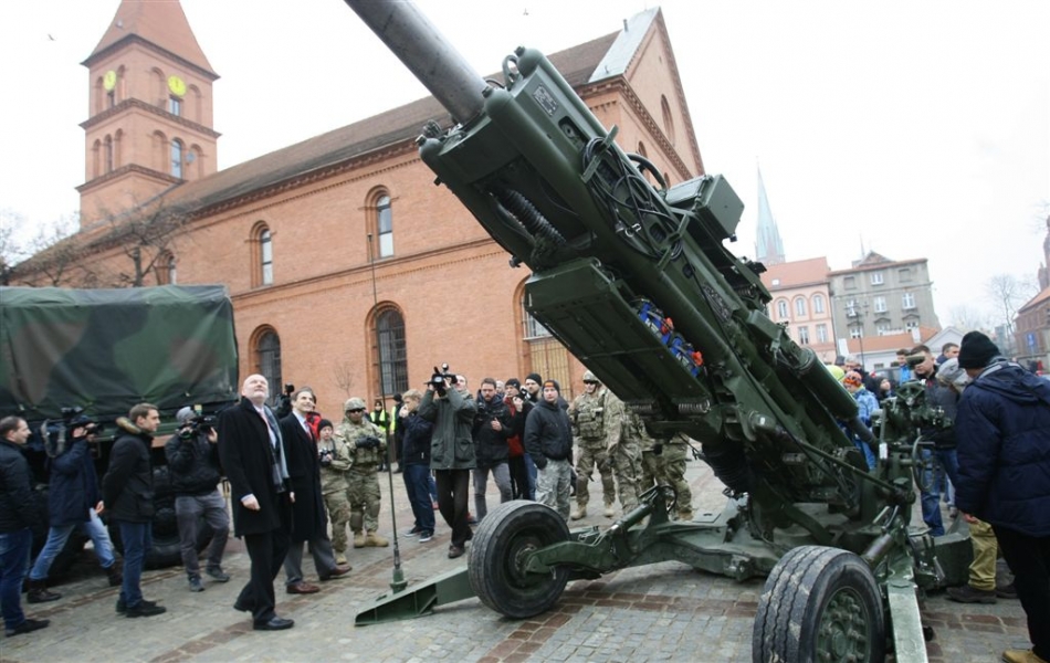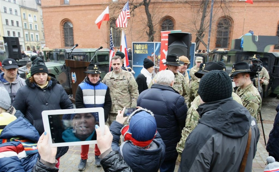 6 lutego 2016 r. w Toruniu gościł ambasador USA Paul Jones i żołnierze z sił NATO, przebywający w Polsce w ramach ćwiczeń „Dragoon Shock”. 5-13 lutego ćwiczą z użyciem artylerii na terenie Centrum Szkolenia Artylerii i Uzbrojenia w Toruniu. W sobotę, 6 lutego spotkali się z mieszkańcami Torunia na Rynku Nowomiejskim. Była okazja do obejrzenia z bliska amerykańskiego sprzętu wojskowego, w tym haubic M777, Humvee oraz pojazdów wspierających. Fot. Adam Zakrzewski