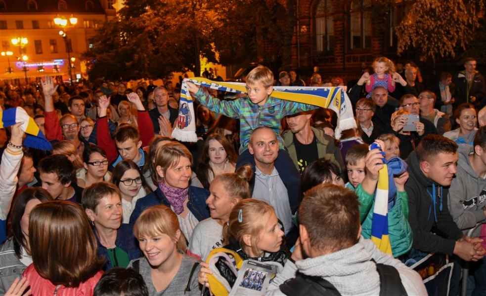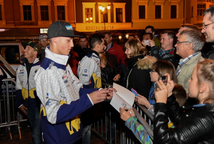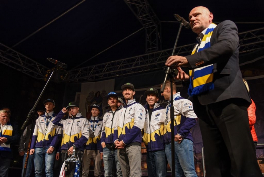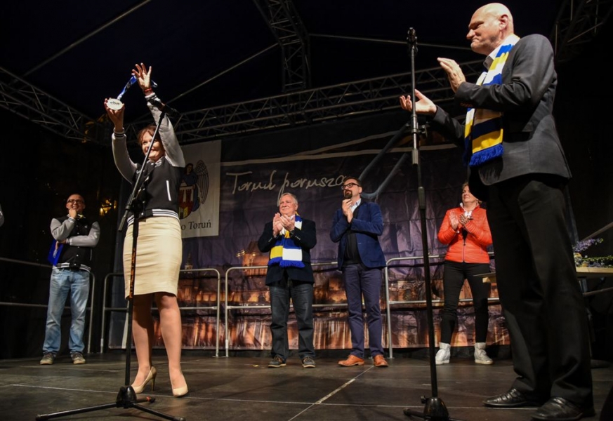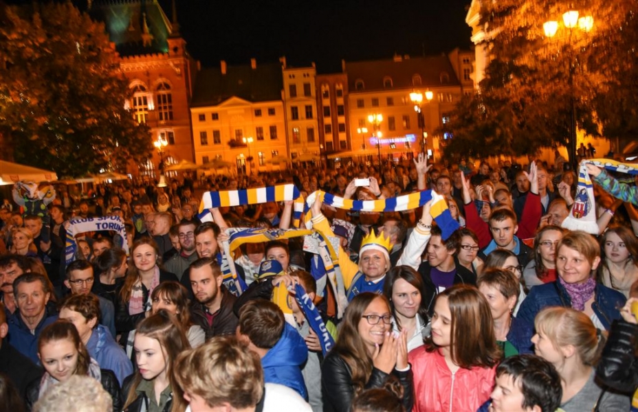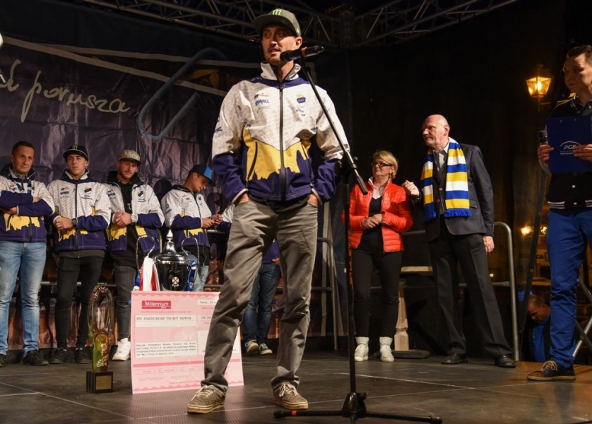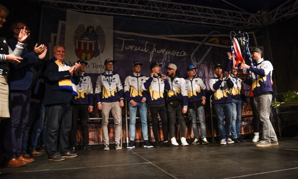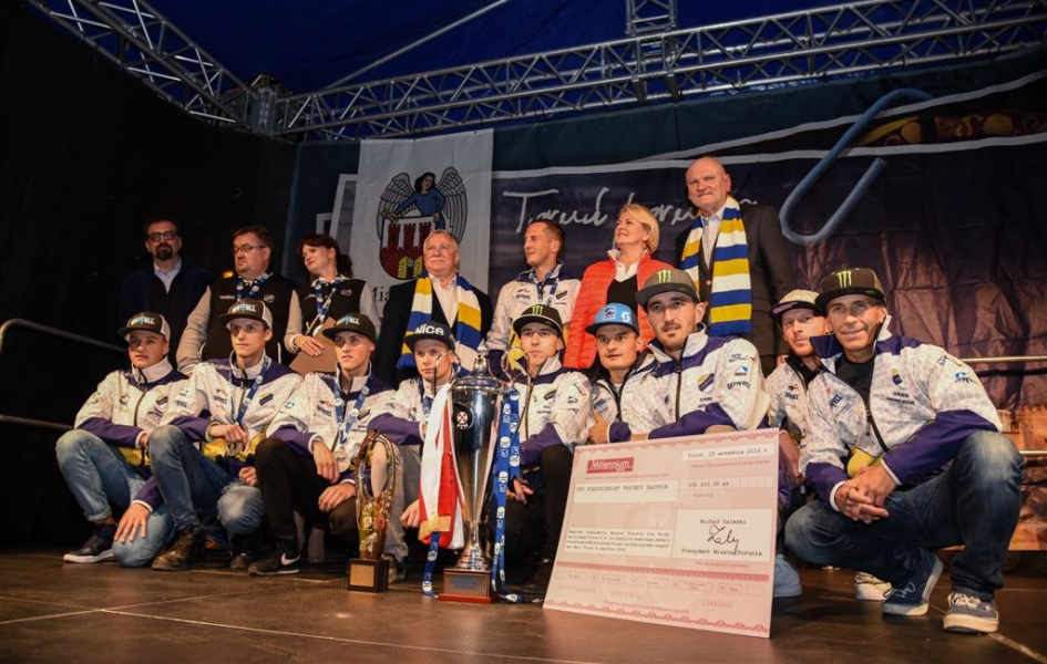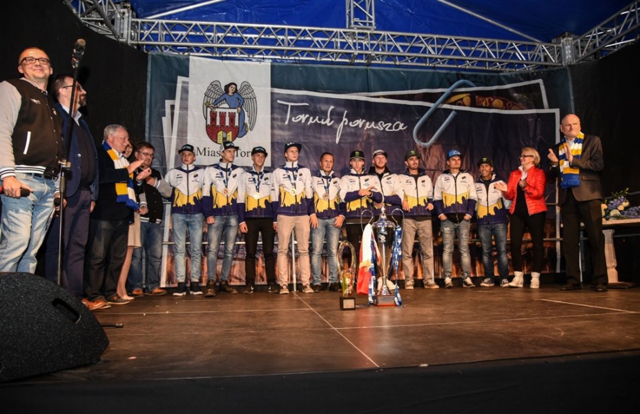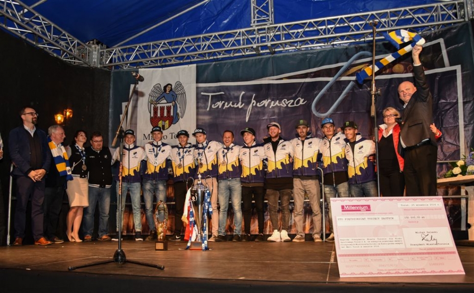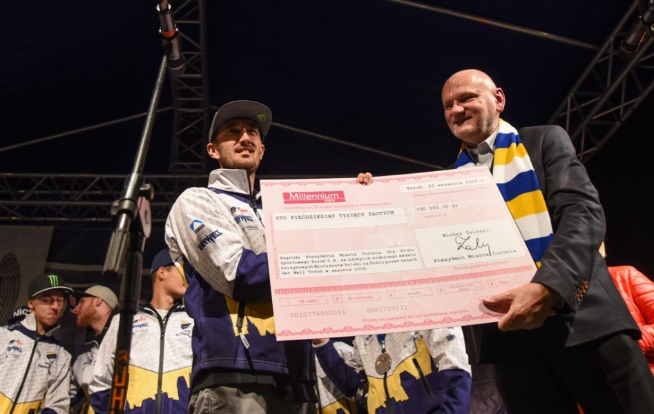 30 września 2016 r. zawodnicy Get Well Toruń spotkali się na toruńskim Rynku Staromiejskim z kibicami. Za zdobycie srebrnego medalu Drużynowych Mistrzostw Polski otrzymali od miasta czek na 150 tys. zł. Wręczył go prezydent Torunia Michał Zaleski. Fot. Lech Kamiński