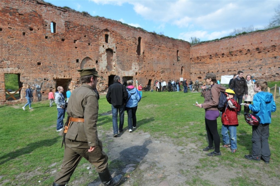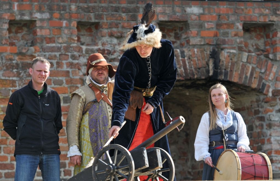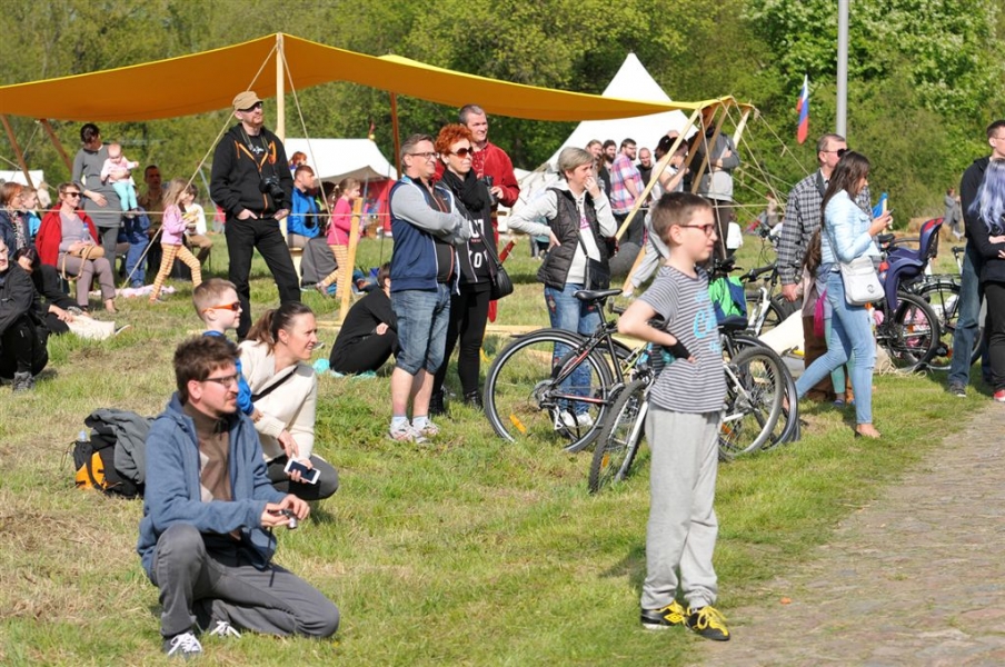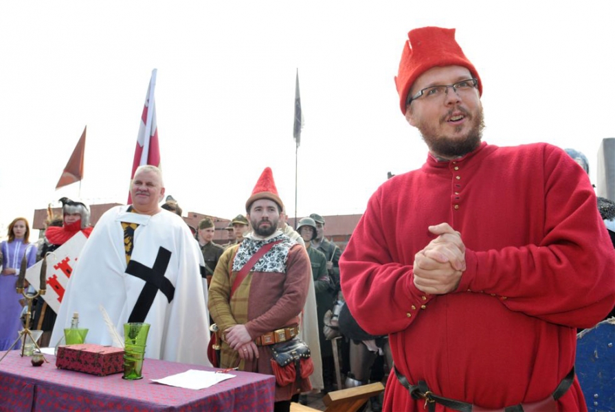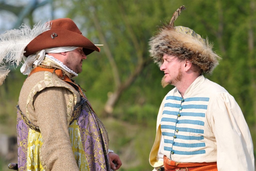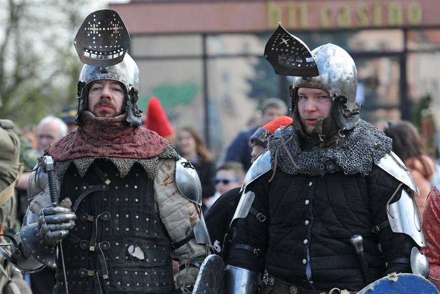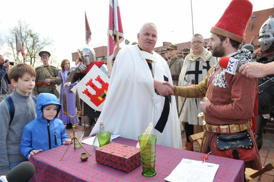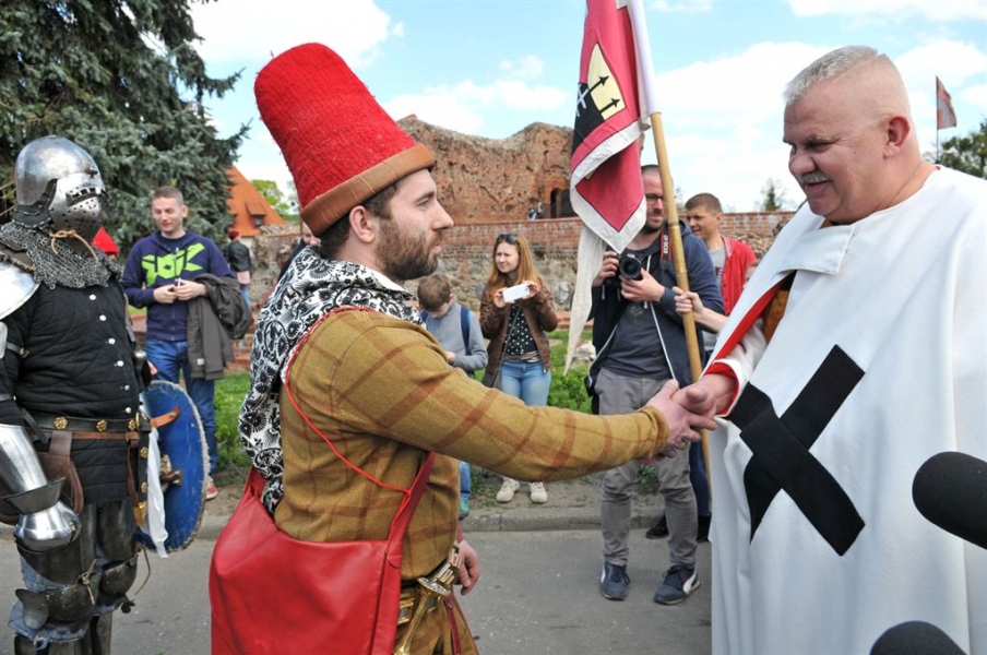 Inscenizacja historyczna pod hasłem "Dwa zamki – dwa brzegi – jedno miasto" zainaugurowała w sobotę, 30 kwietnia kilkudniowy cykl imprez majówkowych na Zamku Krzyżackim i Dybowskim w Toruniu. Starosta Zamku Dybów i Komtur Zamku Krzyżackiego podpisali umowę o współpracy zamków, a następnie historyczny orszak przemaszerował przez starówke i most Piłsudskiego na drugi brzeg Wisły, gdzie w ruinach Zamku Dybowskiego rozpoczął się festyn historyczny. Fot. Małgorzayta Litwin