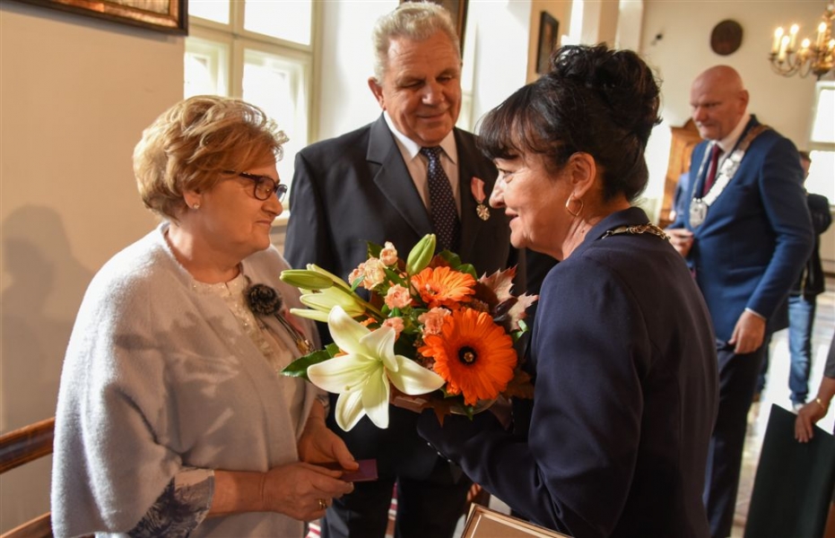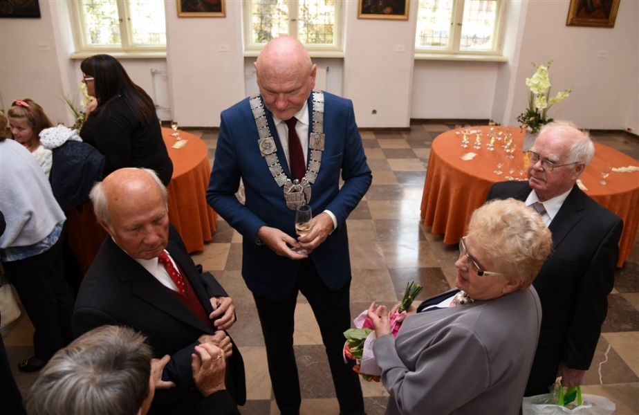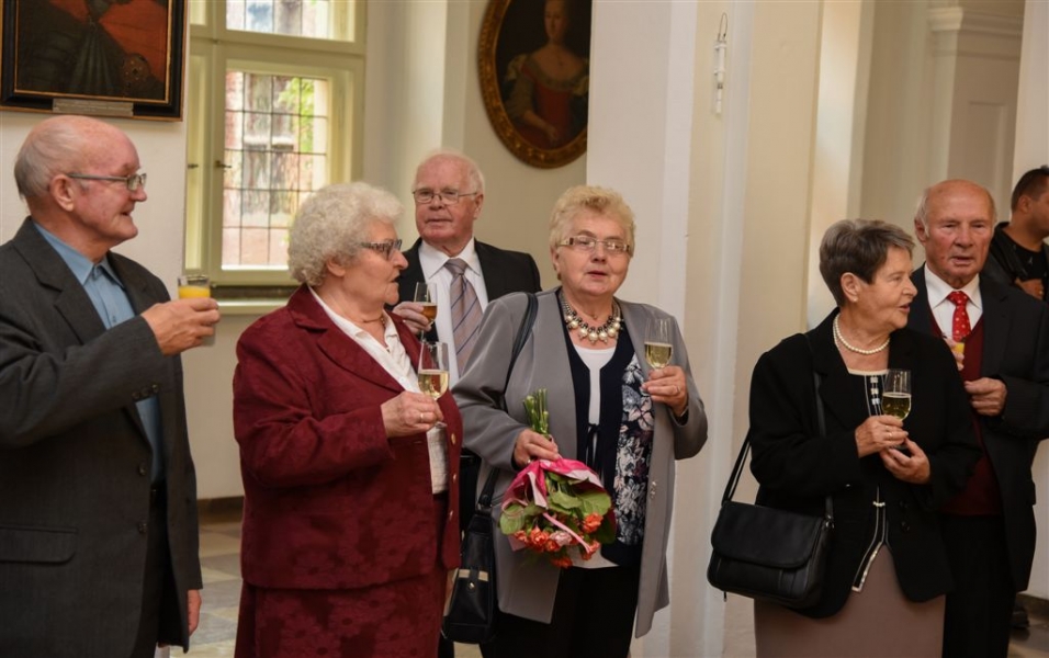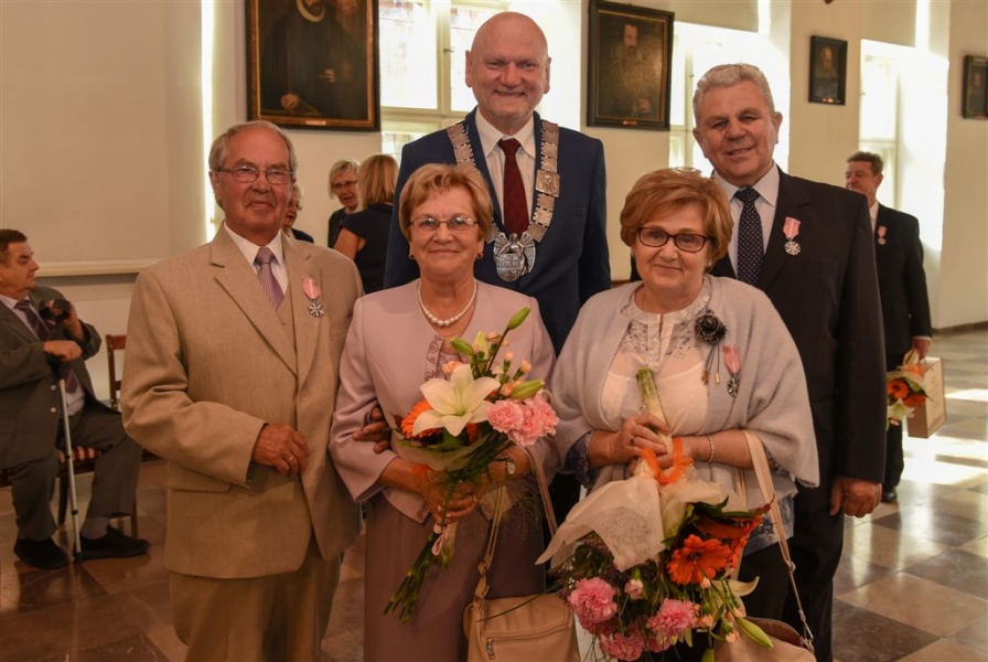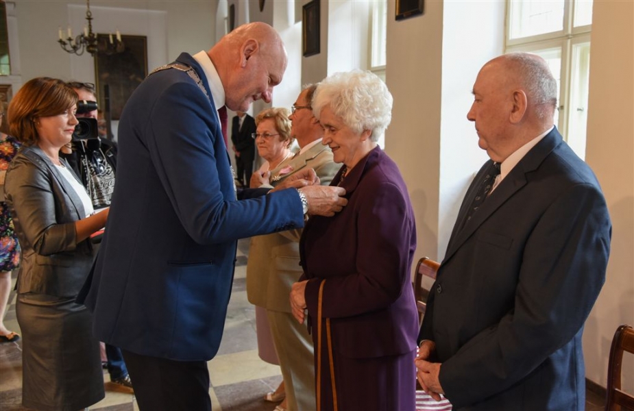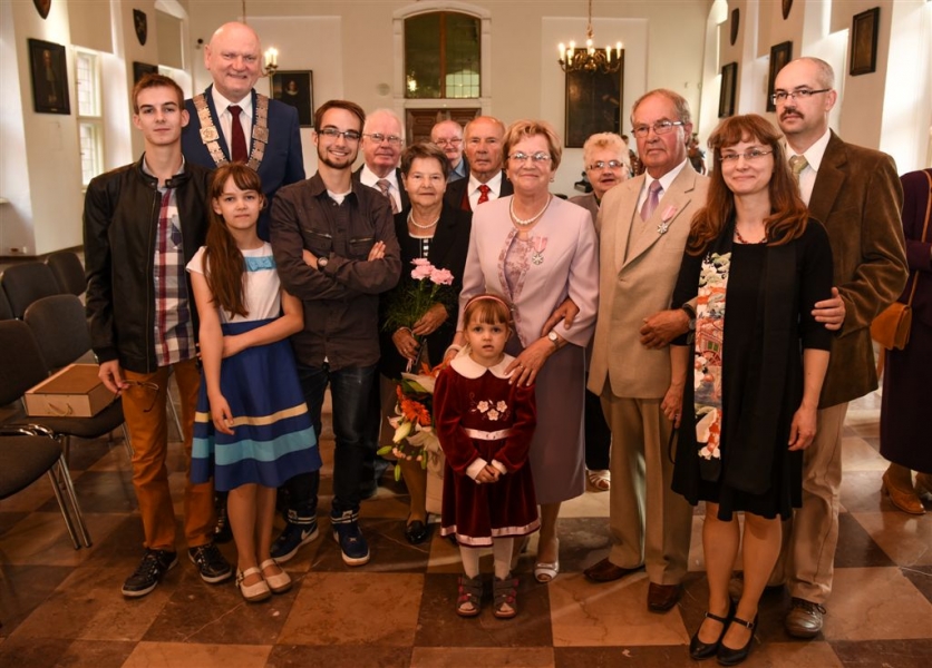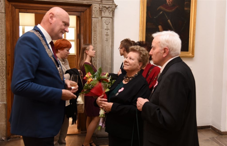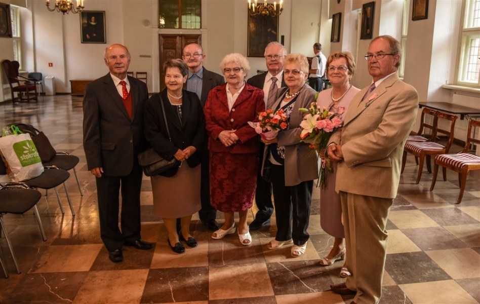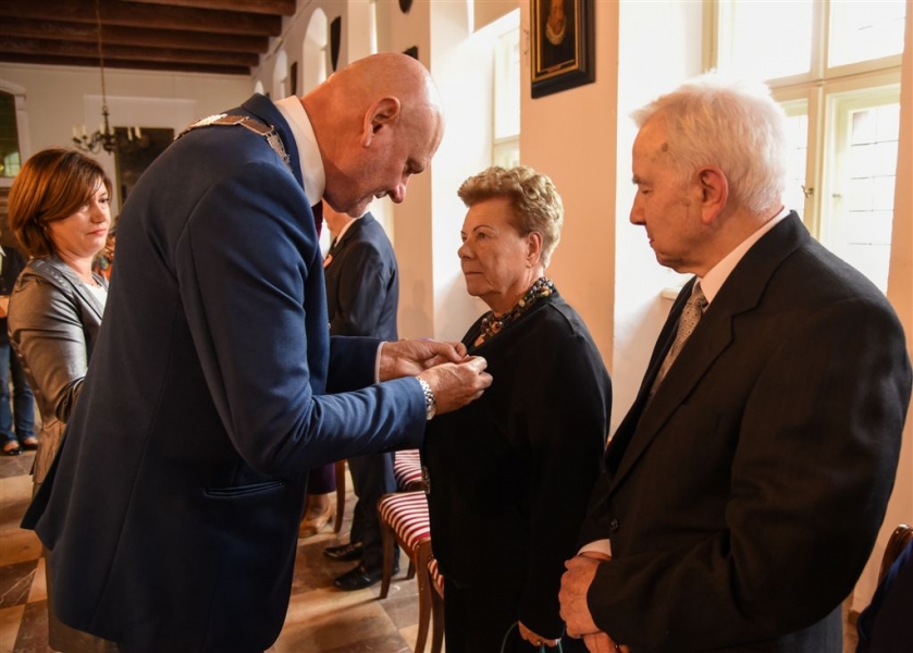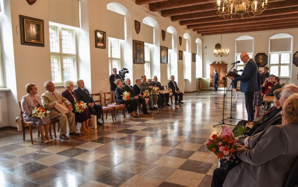 7 toruńskich par świętujących Złote Gody otrzymało 23 września 2016 r. Medale za Długoletnie Pożycie Małżeńskie. Uroczystość odbyła się w Ratuszu Staromiejskim w Toruniu. Medale, nadane małżonkom przez Prezydenta RP, wręczył jubilatom prezydent Torunia Michał Zaleski. Fot. Lech Kamiński