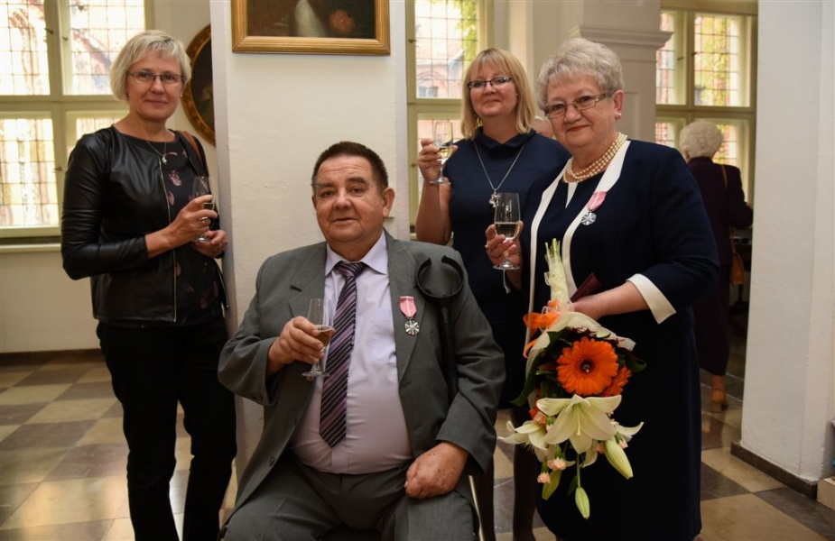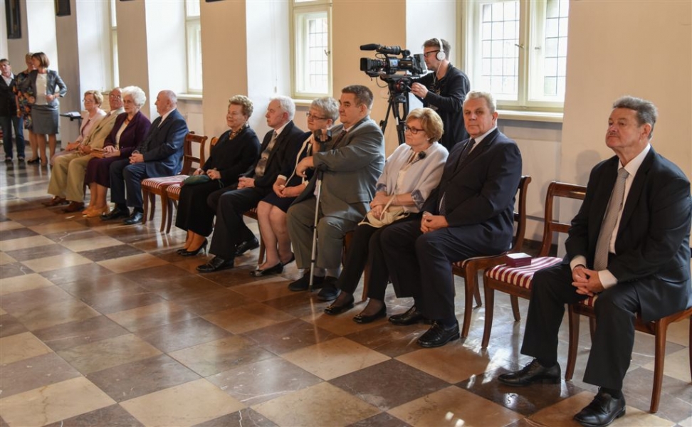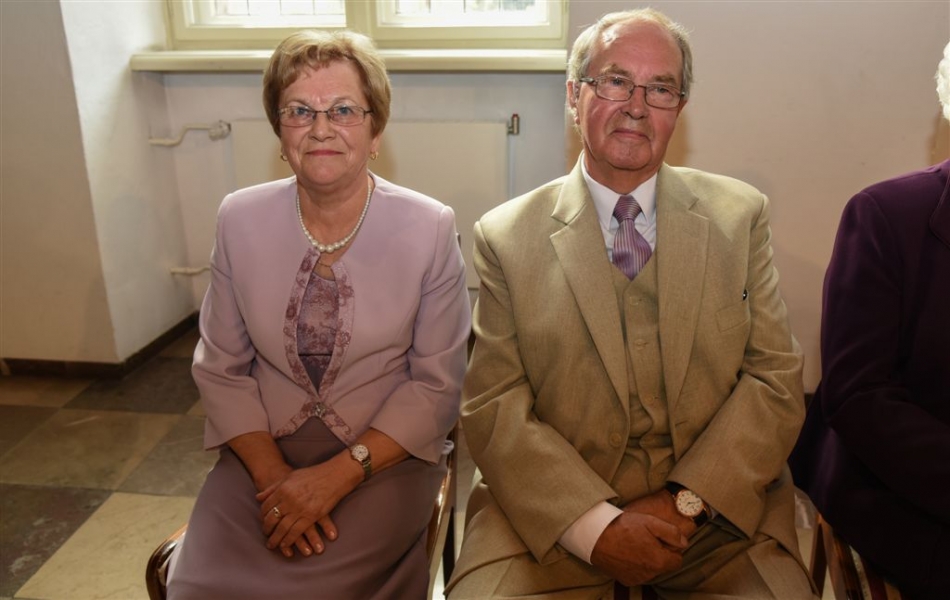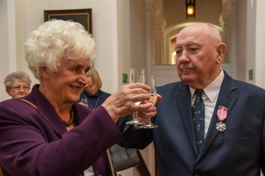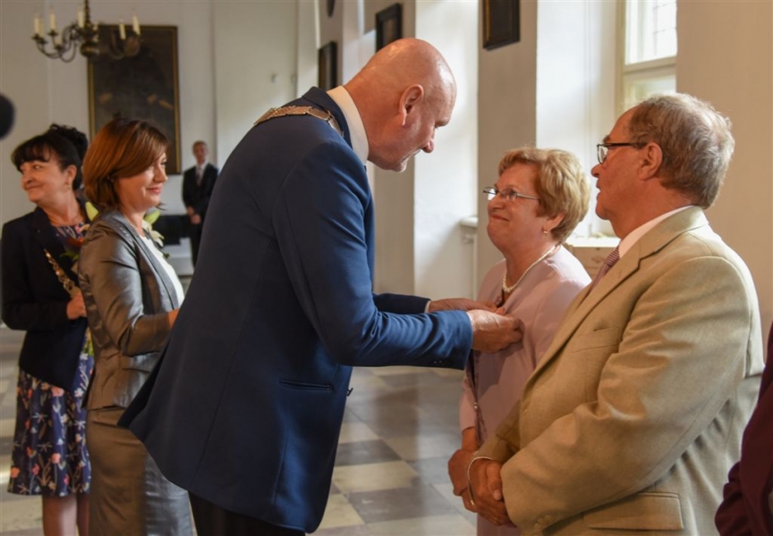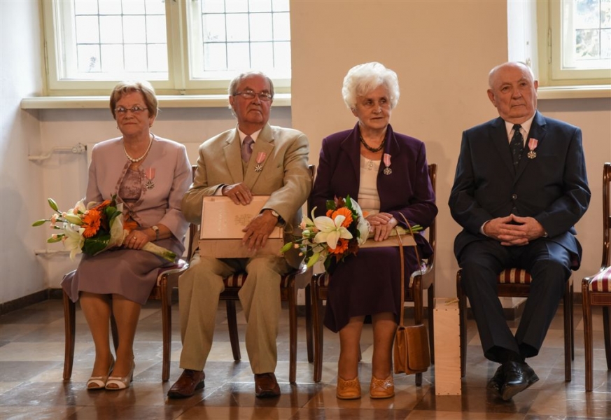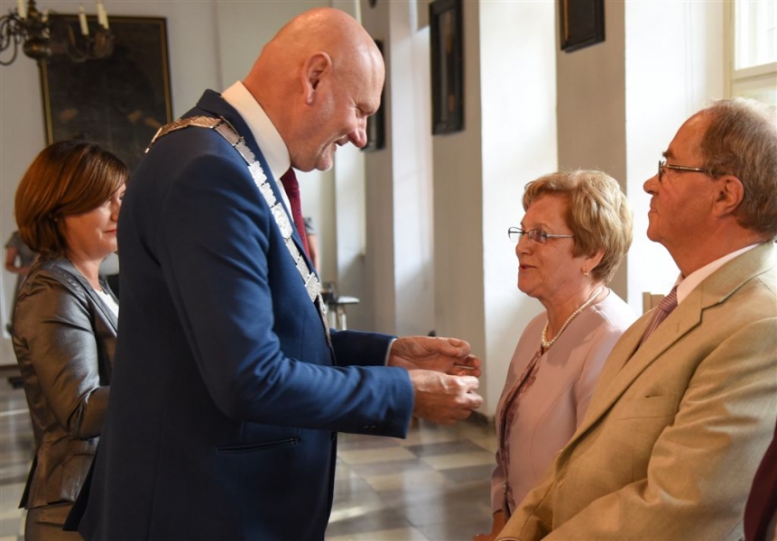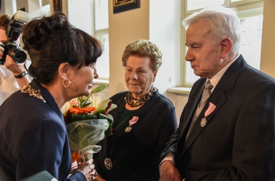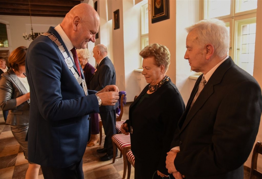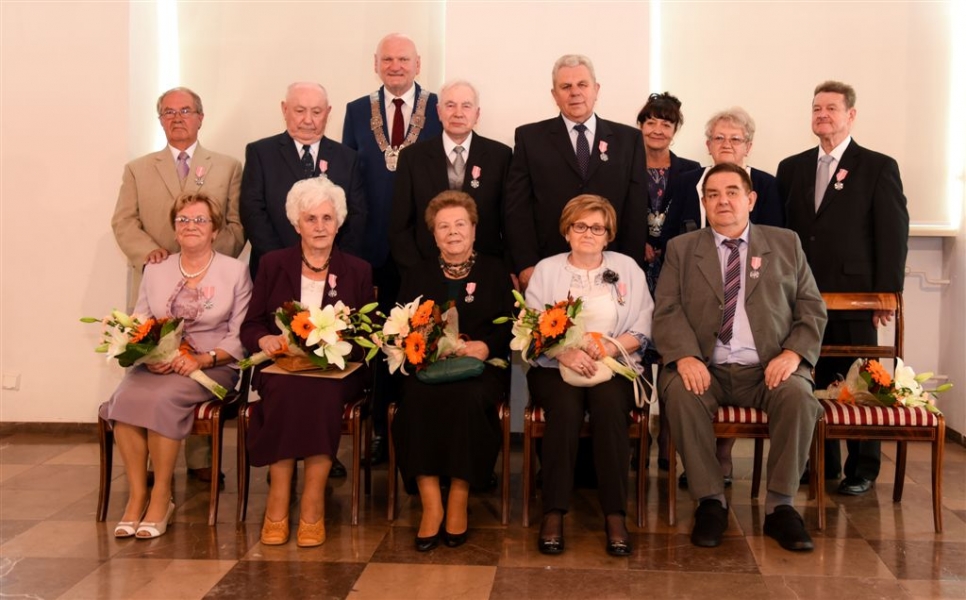 7 toruńskich par świętujących Złote Gody otrzymało 23 września 2016 r. Medale za Długoletnie Pożycie Małżeńskie. Uroczystość odbyła się w Ratuszu Staromiejskim w Toruniu. Medale, nadane małżonkom przez Prezydenta RP, wręczył jubilatom prezydent Torunia Michał Zaleski. Fot. Lech Kamiński