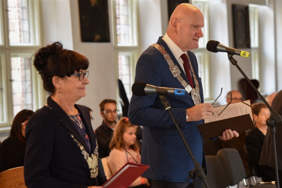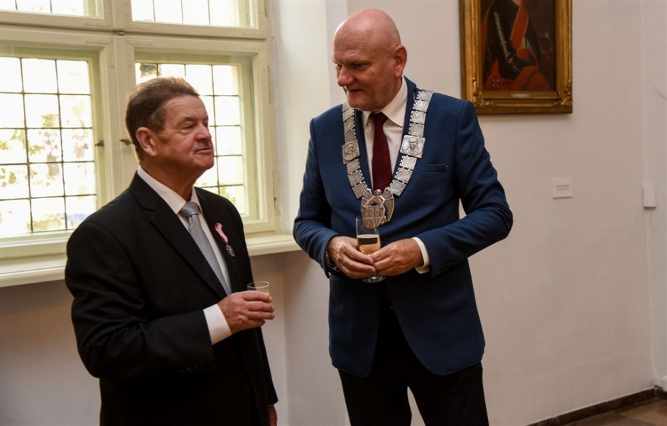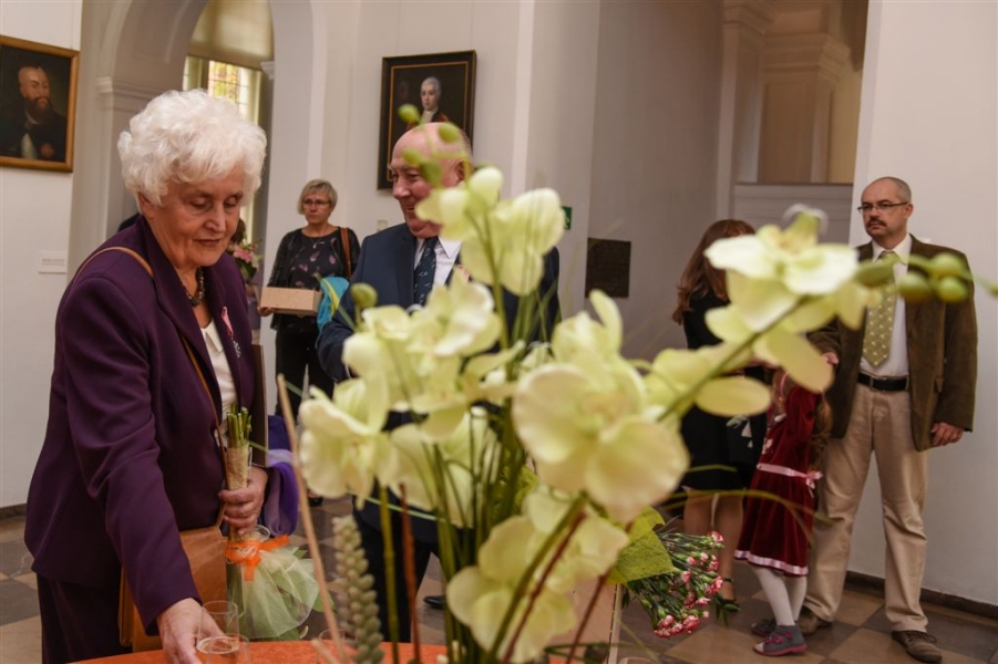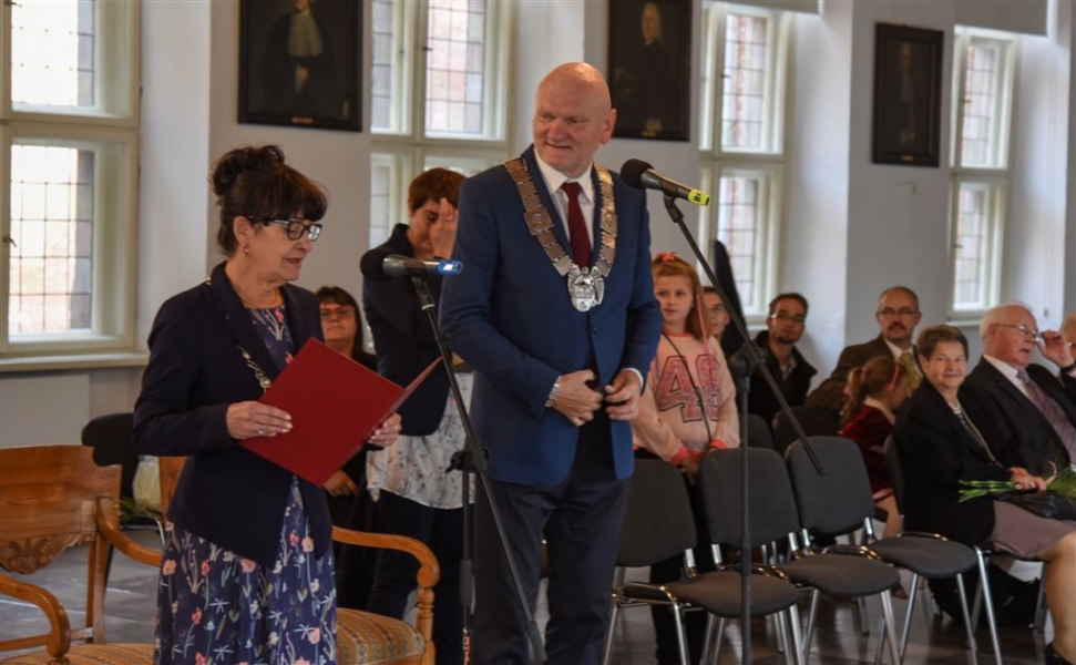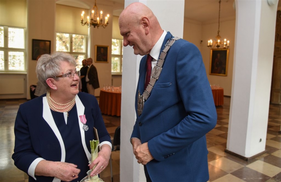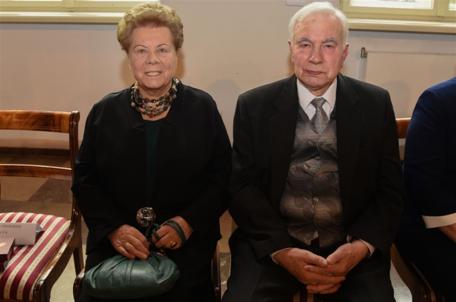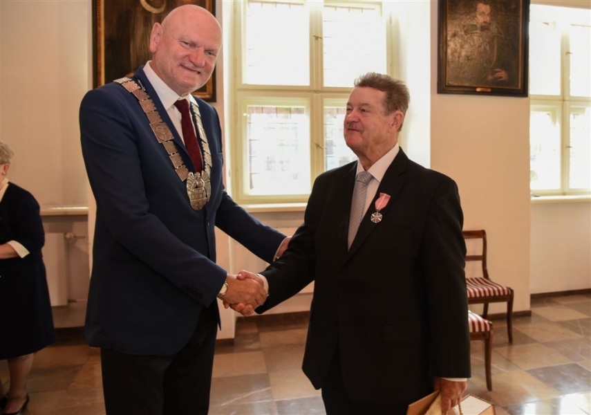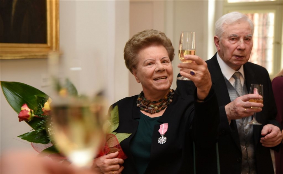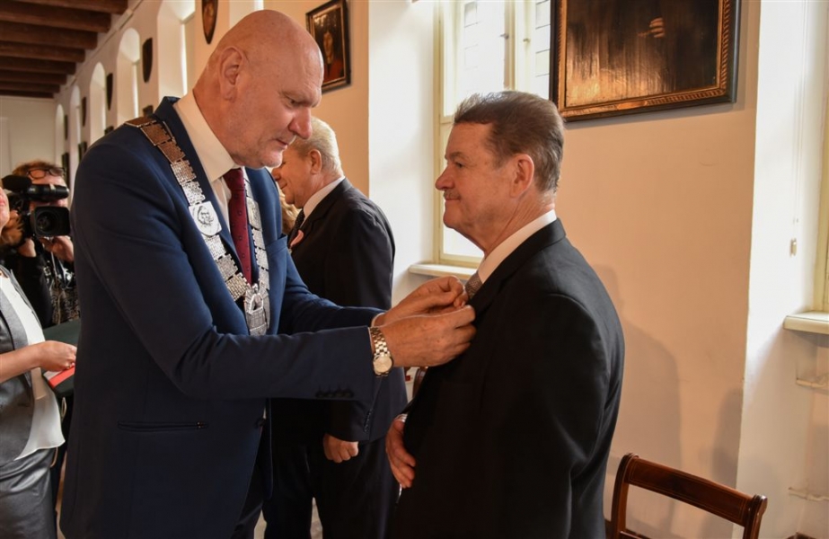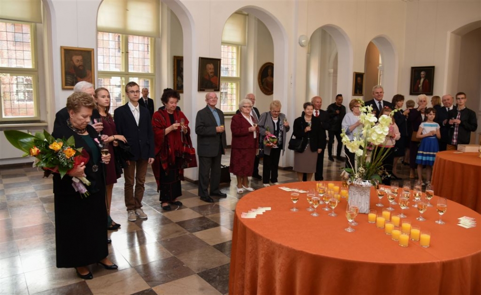 7 toruńskich par świętujących Złote Gody otrzymało 23 września 2016 r. Medale za Długoletnie Pożycie Małżeńskie. Uroczystość odbyła się w Ratuszu Staromiejskim w Toruniu. Medale, nadane małżonkom przez Prezydenta RP, wręczył jubilatom prezydent Torunia Michał Zaleski. Fot. Lech Kamiński