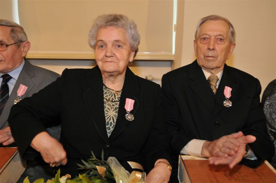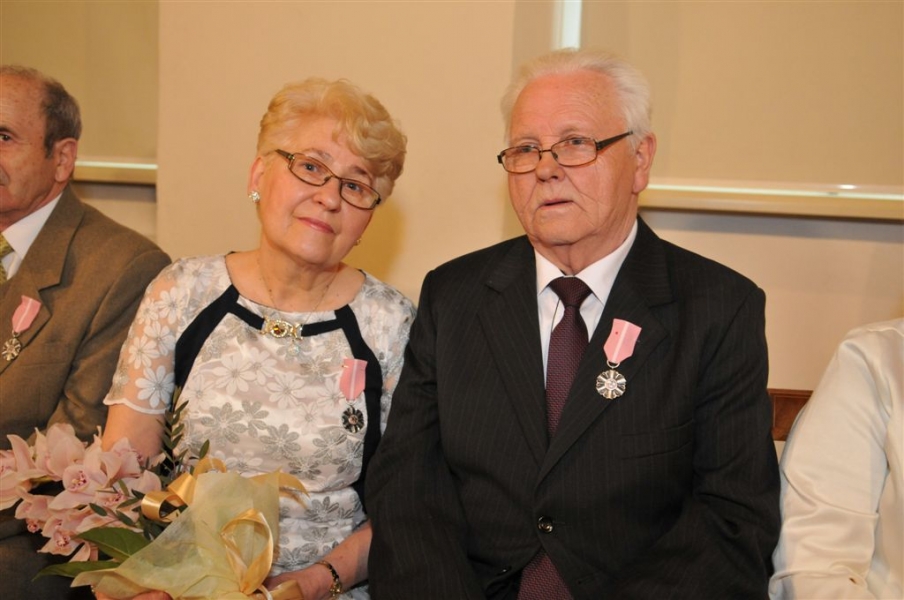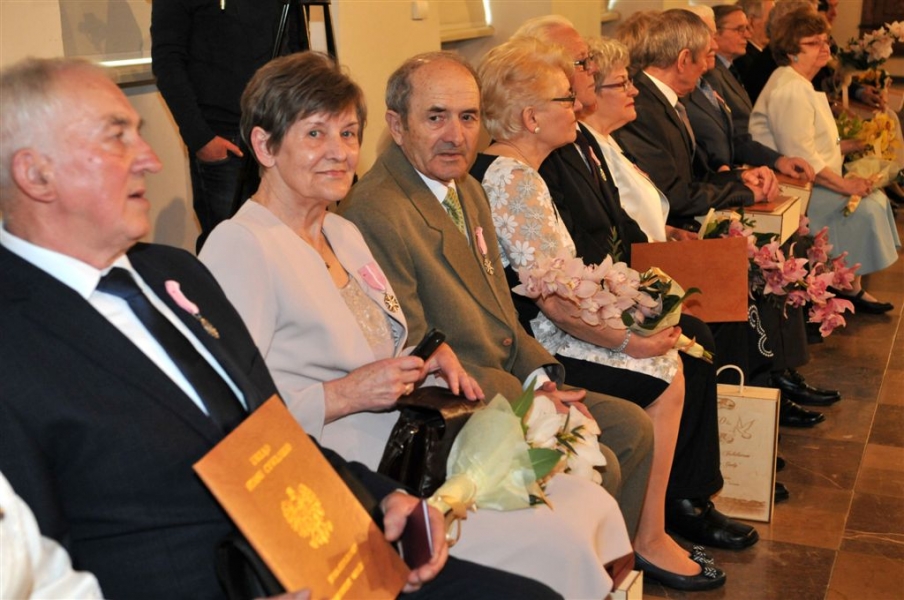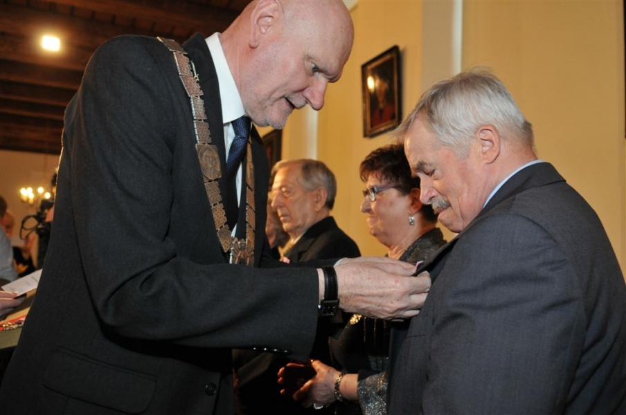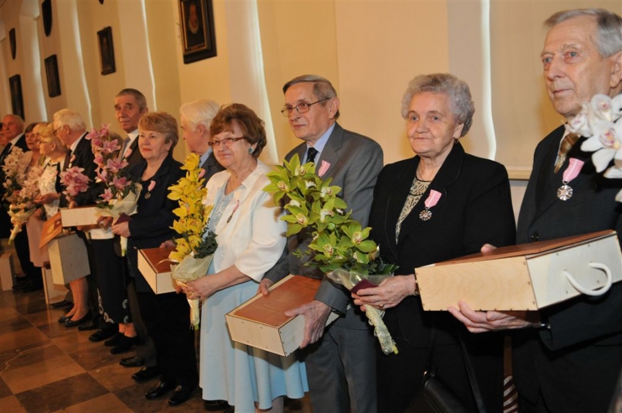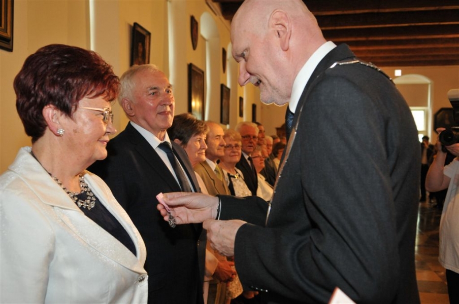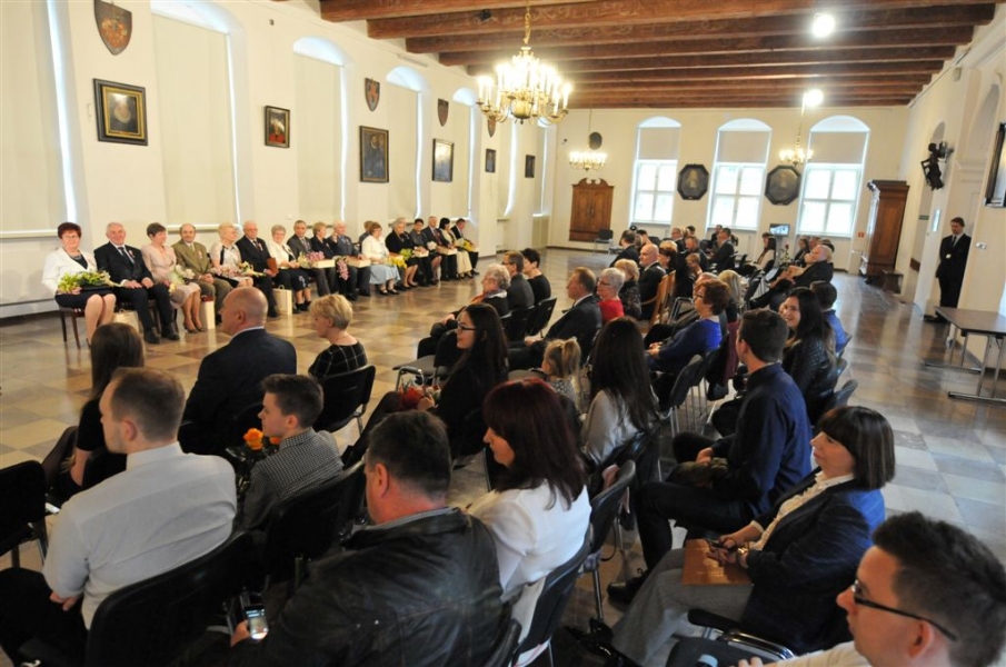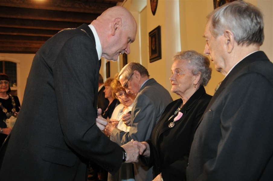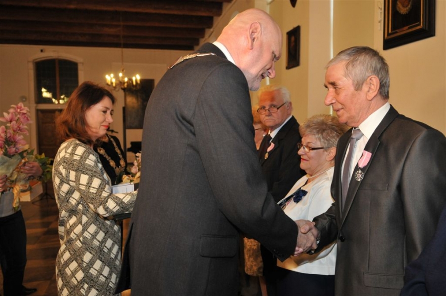 W Ratuszu Staromiejskim w Toruniu dziewięć par małżeńskich świętowało 28 kwietnia 2017 r. jubileusz 50 lat wspólnego życia. Z tej okazji prezydent Torunia Michał Zaleski wręczył im Medale za Długoletnie Pożycie Małżeńskie. Fot. Małgorzata Litwin
