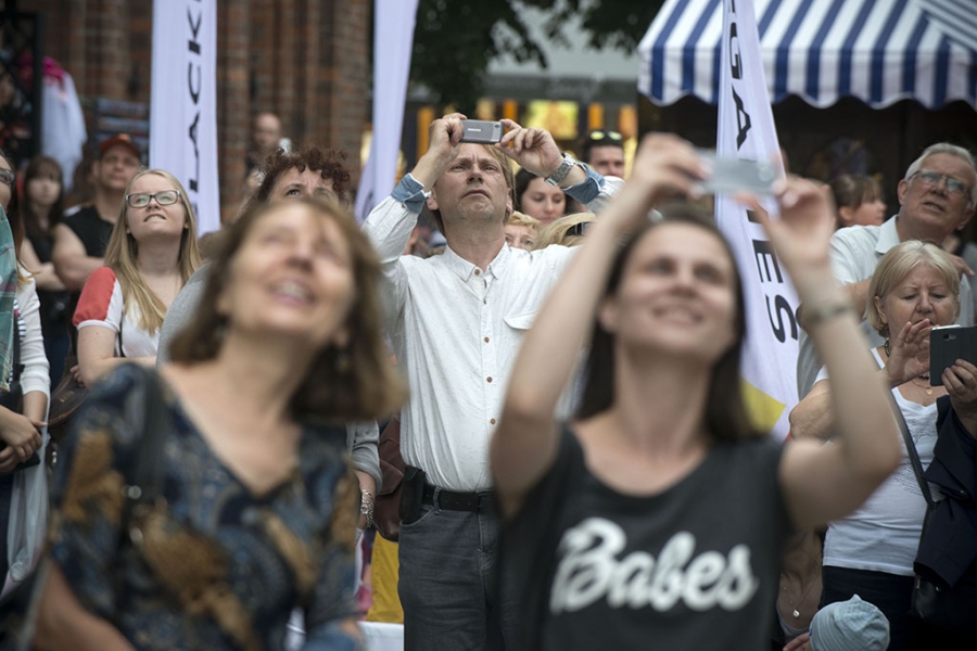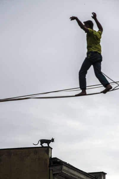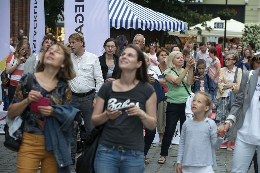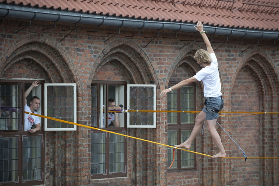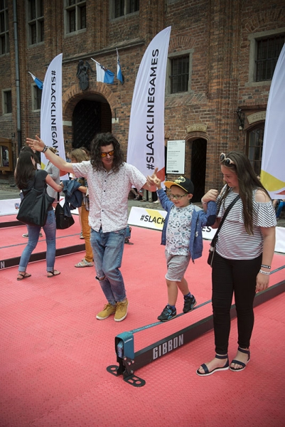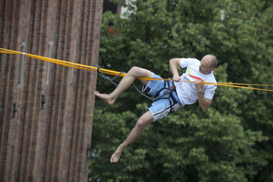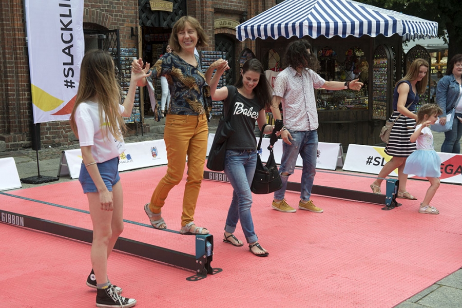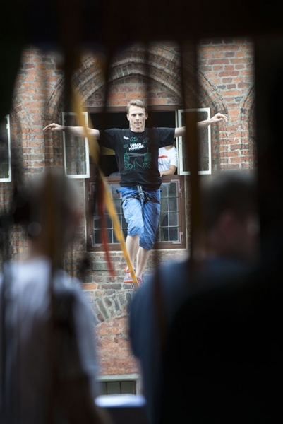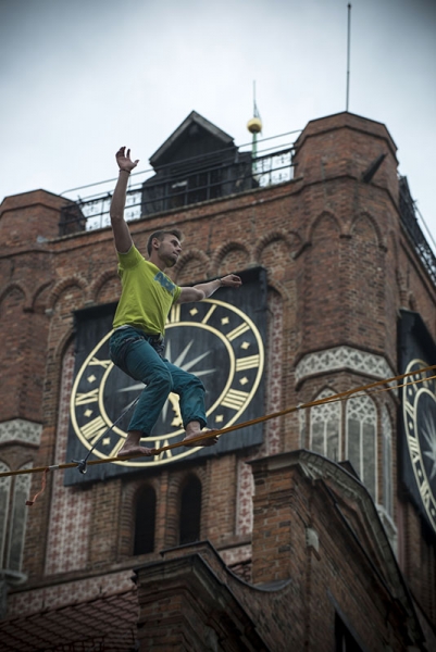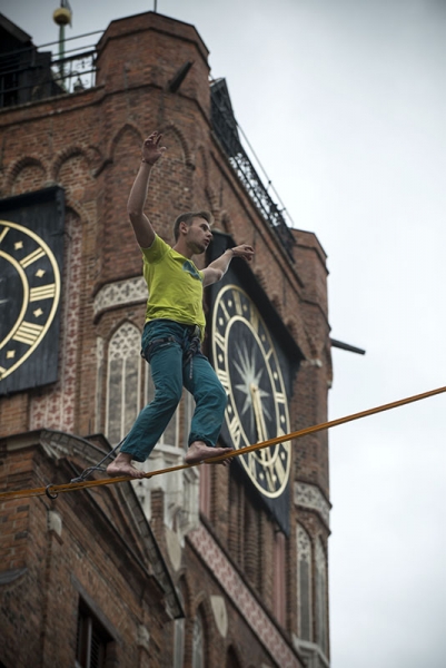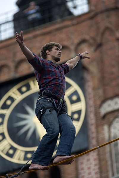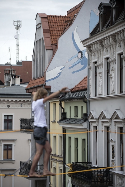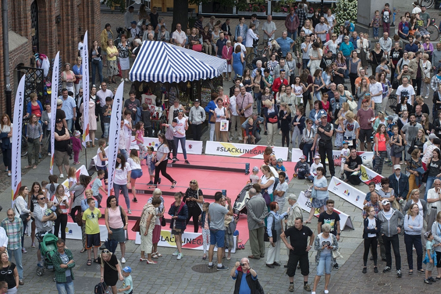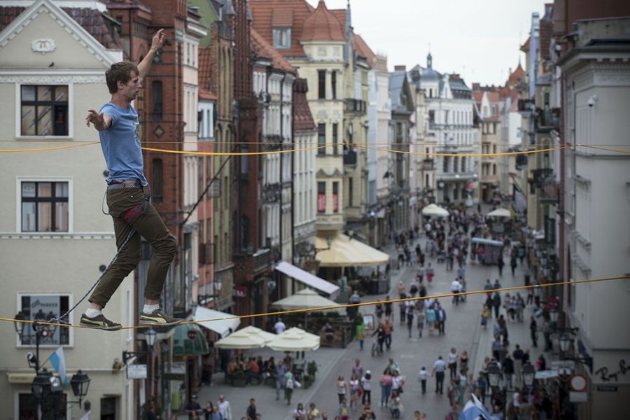 Slackline Games, czyli pokazy najlepszych linoskoczków świata – to jedna z atrakcji Dni Torunia. 22 czerwca 2017 roku swoje umiejętności śmiałkowie zaprezentowali na linie rozciągniętej pomiędzy Ratuszem a Dworem Artusa. Fot. Wojtek Szabelski