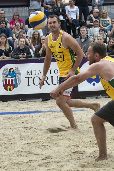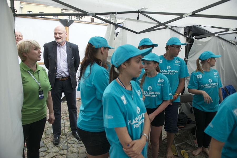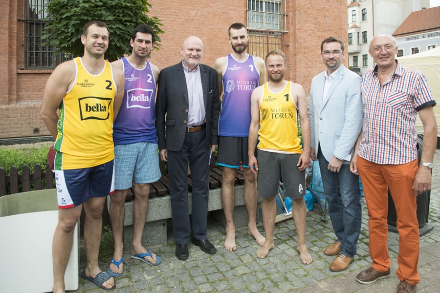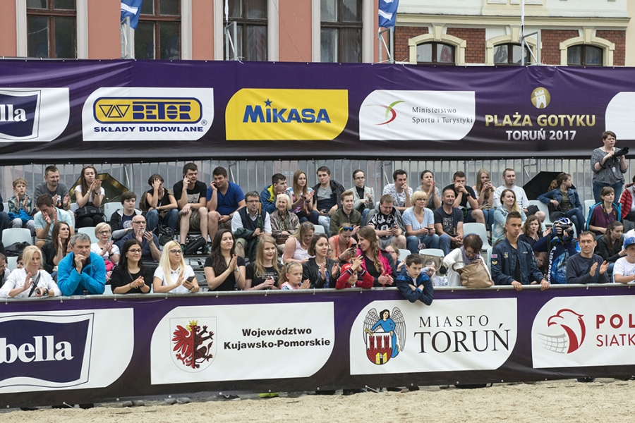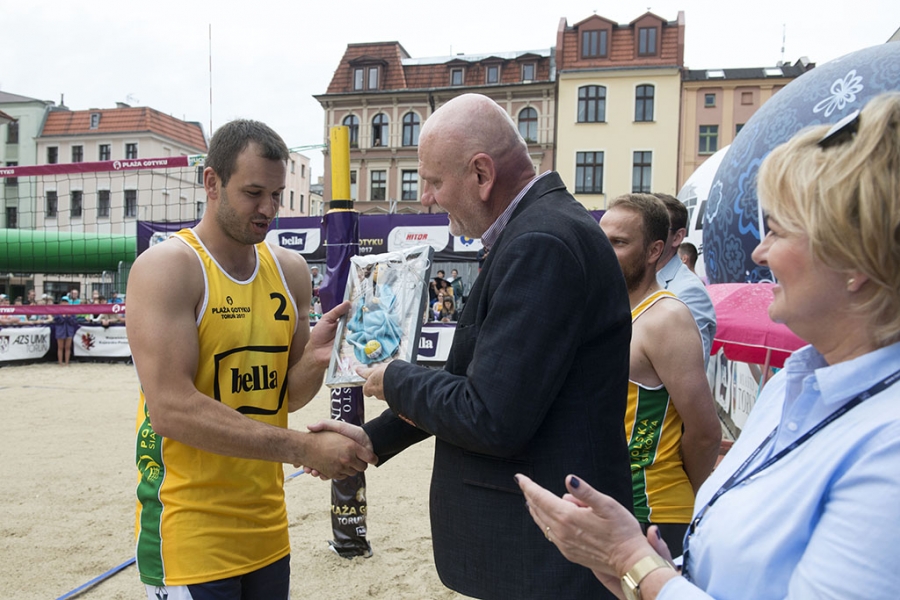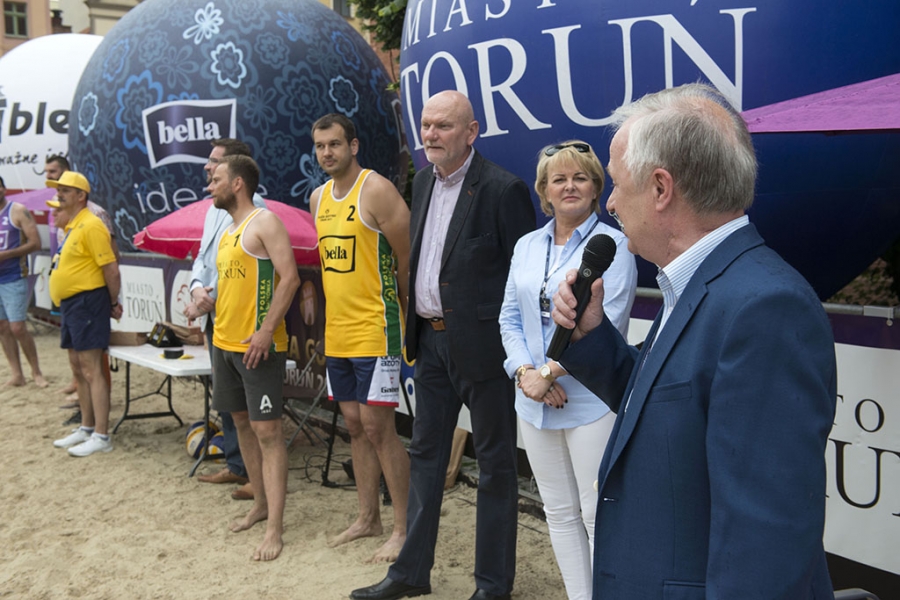 Deszczowa aura nie przeszkodziła siatkarskim gwiazdom w rozegraniu 4 czerwca 2017 r. meczu inaugurującego ósmy turniej siatkówki plażowej BELLA Plaża Gotyku Toruń 2017. Zawody rozpoczęły się 1 czerwca i potrwaja do 11 czerwca 2017 r. w programie turnieje juniorskie, amatorskie, kobiece, męskie i par mieszanych. Fot. Wojtek Szabelski