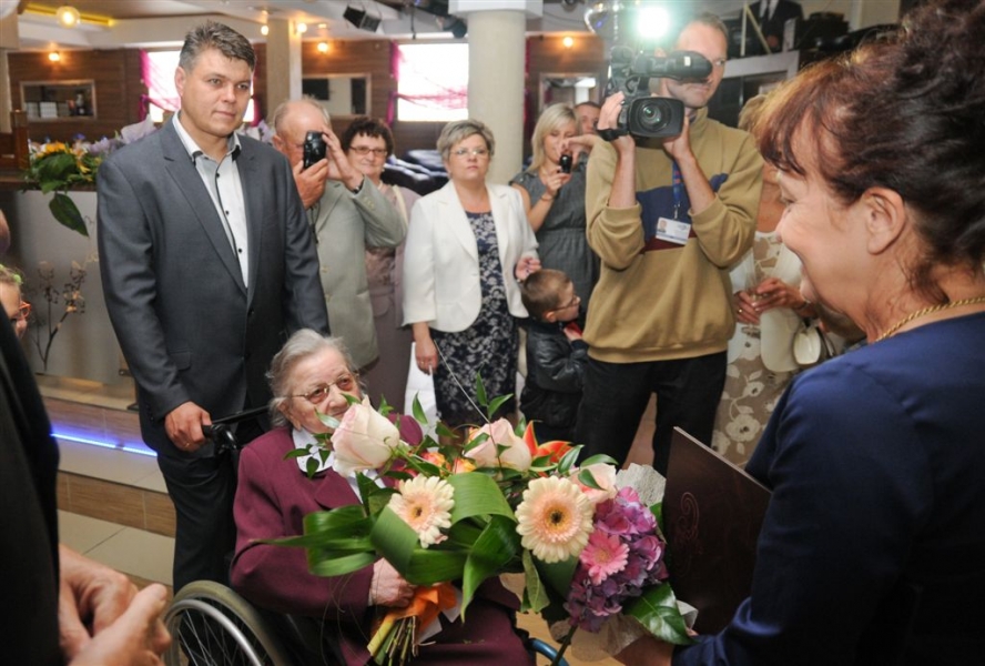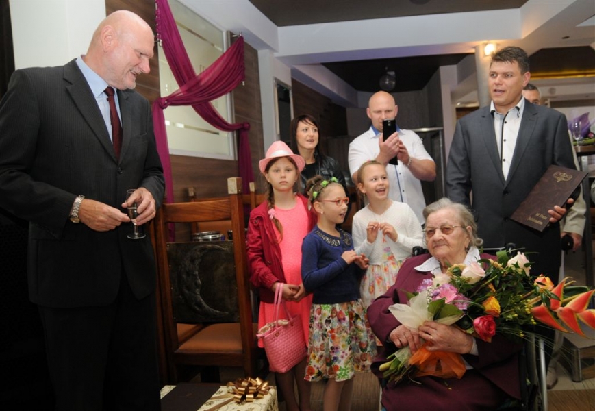 Sto lat skończyła 26 lipca 2015 r. torunianka Władysława Rojek. Z tej okazji odwiedził ją z listem gratulacyjnym i bukietem kwiatów prezydent Torunia Michał Zaleski. Fot. Lech Kamiński