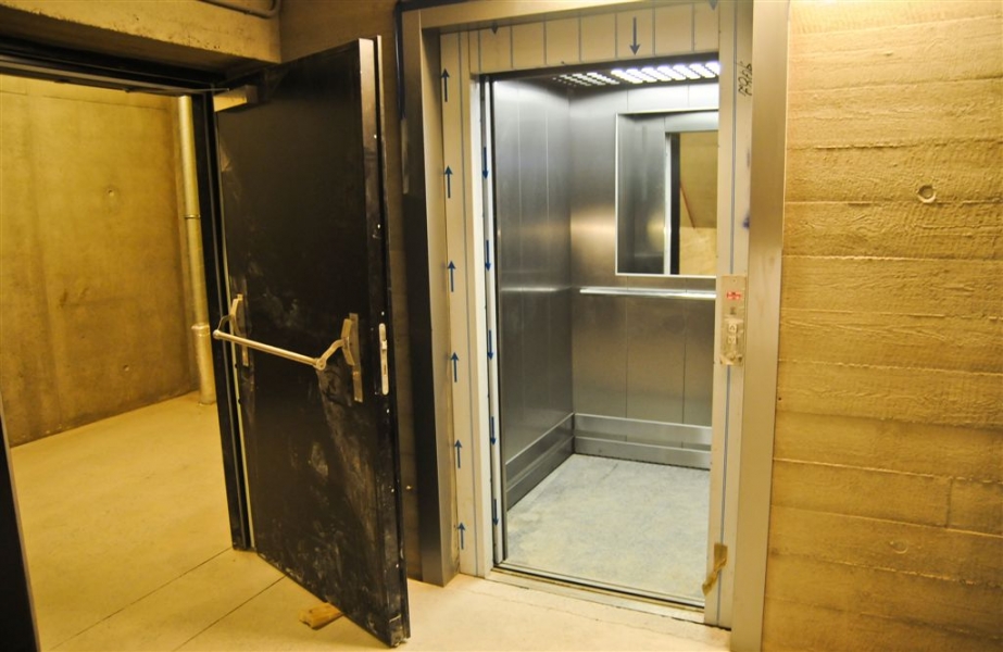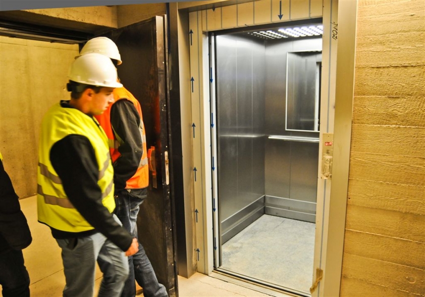 W nowo budowanej sali koncertowo-kongresowej na toruńskich Jordankach działają już windy. Obiekt został wyposażony w cztery windy osobowe i specjalną windę do transportu fortepianu między sceną a salą prób. Oprócz tego są trzy zapadnie transportowe i cztery sceniczne. Największa ma 7,5 tony nośności. Najszybsze są zapadnie sceniczne, które poruszają się z prędkością 0,3 m/s. Fot. Lech Kamiński