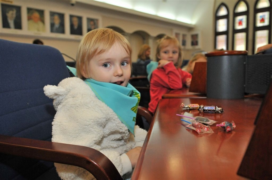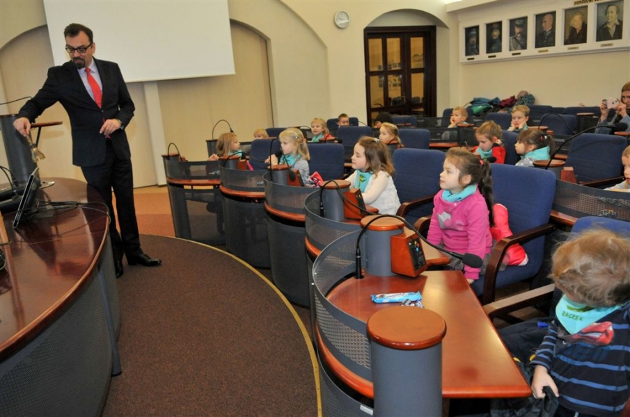 4 listopada 2015 r. w Urzędzie Miasta Torunia gościła grupa dzieci z Przedszkola Niepublicznego "Raczek" w Toruniu. Maluchy miały okazję zasiąść w fotelach radnych Rady Miasta Torunia i dowiedzieć się od przewodniczącego rady Marcina Czyżniewskiego, jakie są symbole naszego miasta, czym się zajmują radni i prezydent oraz jak zostać Honorowym Obywatelem Torunia. Fot. Małgorzata Litwin