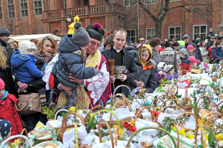 Zgodnie z wieloletnią toruńską tradycją w Wielką Sobotę, 26 marca 2016 r. na toruńskim Rynku Staromiejskim odbyło się święcenie wielkanocnych pokarmów. Poświęcenia wielkanocnych koszyczków dokonał proboszcz parafii katedralnej ks. prałat Marek Rumiński, a prezydent Torunia Michał Zaleski złoży świąteczne życzenia mieszkańcom i gościom miasta. Uroczystości towarzyszyła impreza pod hasłem "Jedz żur, a będziesz silny jak tur", podczas której odbyło się gotowanie oraz degustacja żuru przygotowanego przez Klub Integracji Społecznej przy MOPR w Toruniu. Fot. Małgorzata Litwin