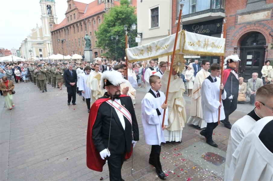 Ulicami toruńskiej starówki przeszła w czwartek, 26 maja 2016 r. procesja Bożego Ciała. Poprzedziła ją Msza św. w toruńskiej katedrze śs. Janów, koncelebrowana przez Biskupa Toruńskiego ks. Andrzeja Suskiego. W uroczystości wzięli udział parlamentarzyści, przedstawiciele toruńskiego samorządu i zołnierze Garnizonu Toruń. Fot. Małgorzata Litwin