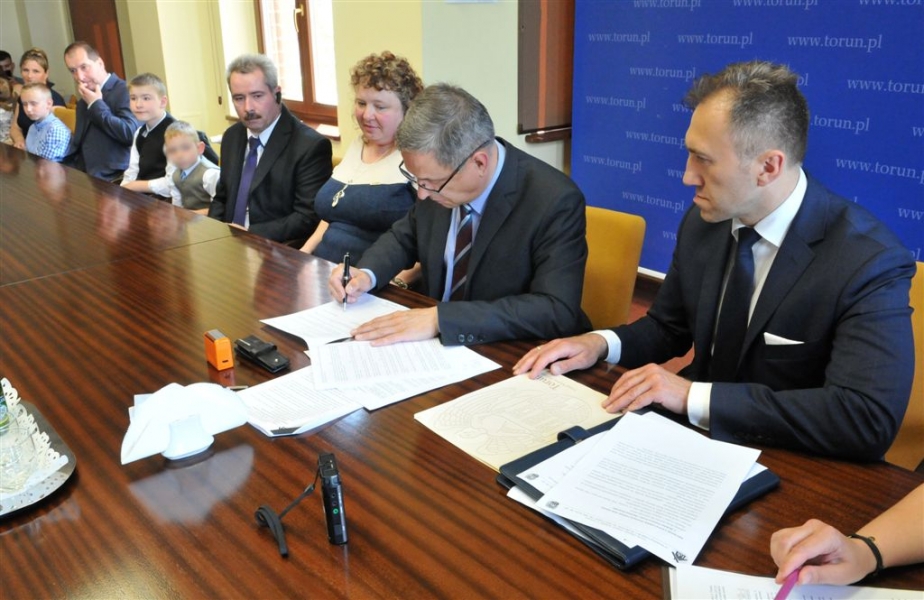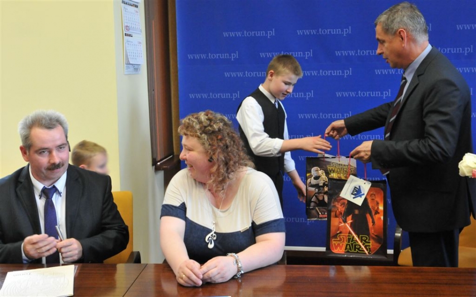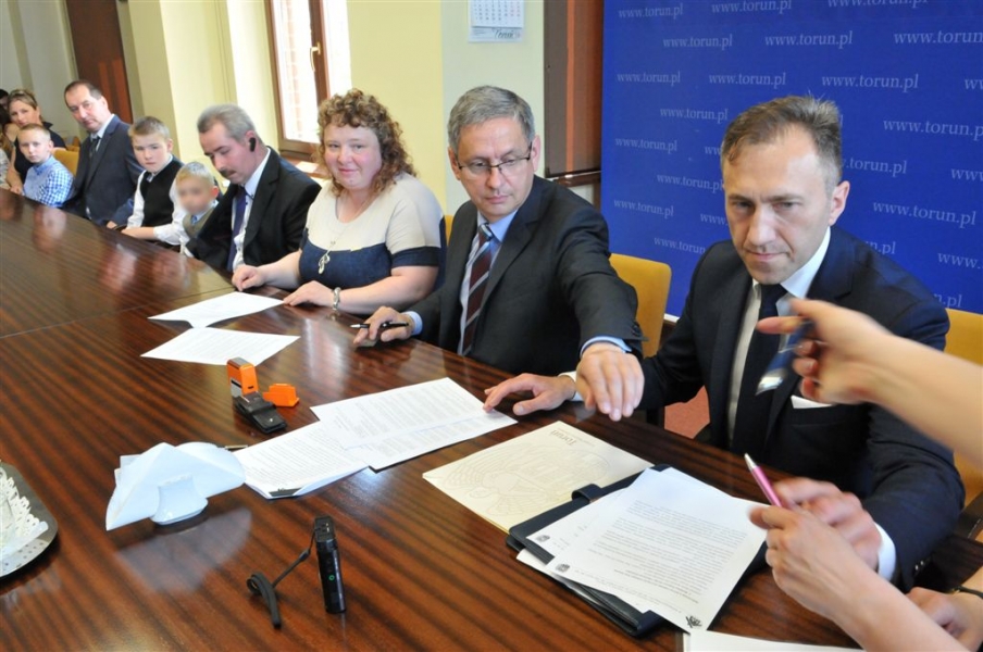 Kolejna toruńska rodzina zdecydowała się stworzyć rodzinny dom dziecka. W poniedziałek, 30 maja 2016 r. - w Dniu Rodzicielstwa Zastępczego - umowę z miastem podpisali państwo Iwona i Dariusz Deszczka. To dziesiąty rodzinny dom dziecka, który będzie działał w Toruniu. W sumie wychowuje się w nich obecnie 53 dzieci. W sumie w różnych formach pieczy zastępczej przebywa w Toruniu 417 dzieci. Fot. Małgorzata Litwin