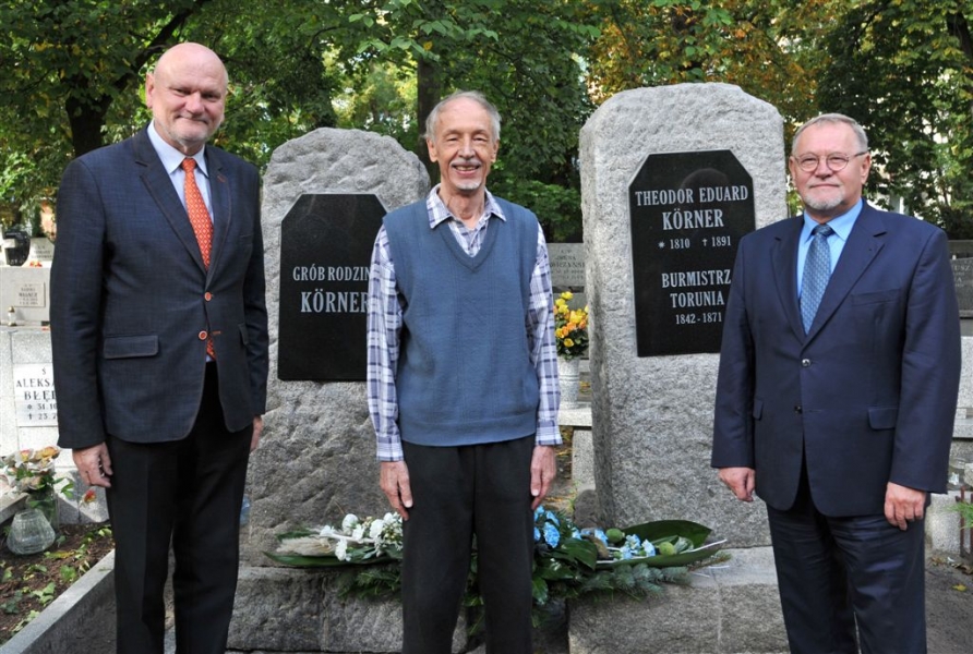Wybitny niemiecki językoznawca prof. Konrad Koerner, który 29 września 2016 roku, podczas uroczystej inauguracji roku akademickiego na UMK, odebrał doktorat honoris causa, w piątek złożył kwiaty na cmentarzu św. Jerzego, na grobie swojego pradziadka Theodora Eduarda Körnera, wybitnego burmistrza Torunia w latach 1842-1871. Nagrobki rodziny Körnerów zostały odnowione w 2016 r. wspólnym staraniem miasta i uniwersytetu. Fot. Małgorzata Litwin