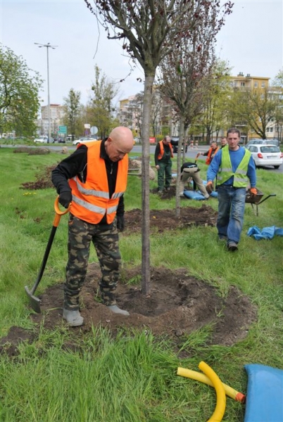Przy placu Pokoju Toruńskiego 25 kwietnia 2017 r. zostało posadzonych 12 dorodnych śliw ozdobnych. Tylko w tym tygodniu w różnych punktach miasta zostanie posadzonych 200 nowych drzew, a w całym roku 2017 aż 3500. To między innymi nasadzenia zastępcze za drzewa usunięte w związku z rozbudową Wojewódzkiego Szpitala Zespolonego w Toruniu. Fot. Małgorzata Litwin