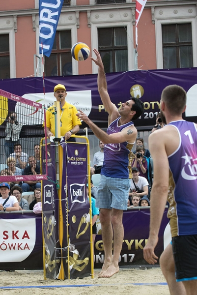 Deszczowa aura nie przeszkodziła siatkarskim gwiazdom w rozegraniu 4 czerwca 2017 r. meczu inaugurującego ósmy turniej siatkówki plażowej BELLA Plaża Gotyku Toruń 2017. Zawody rozpoczęły się 1 czerwca i potrwaja do 11 czerwca 2017 r. w programie turnieje juniorskie, amatorskie, kobiece, męskie i par mieszanych. Fot. Wojtek Szabelski