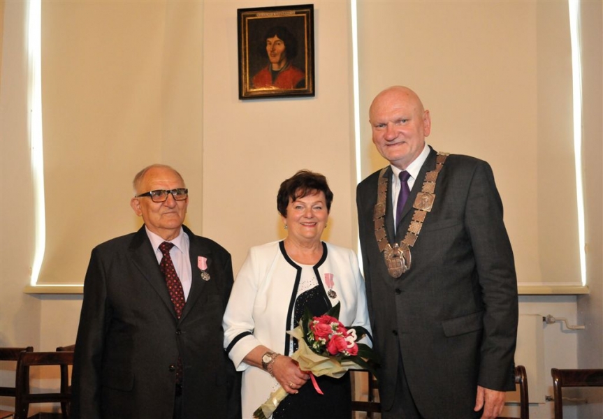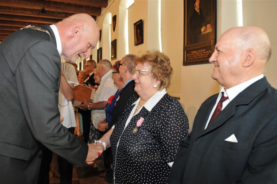 11 par małżeńskich mieszkających w Toruniu zostało odznaczonych Medalami za Długoletnie Pożycie Małżeńskie. Uroczystość wręczenia odbyła się 20 czerwca 2017 r. w Ratuszu Staromiejskim. Medale nadane przez Prezydenta RP jubilaci otrzymali z rąk prezydenta Michała Zaleskiego. Fot. Małgorzata Litwin
