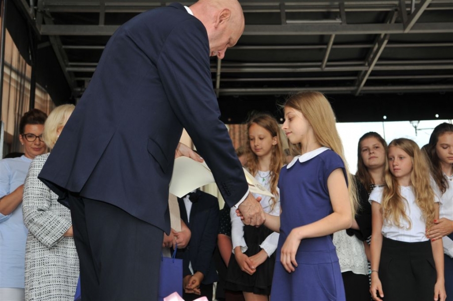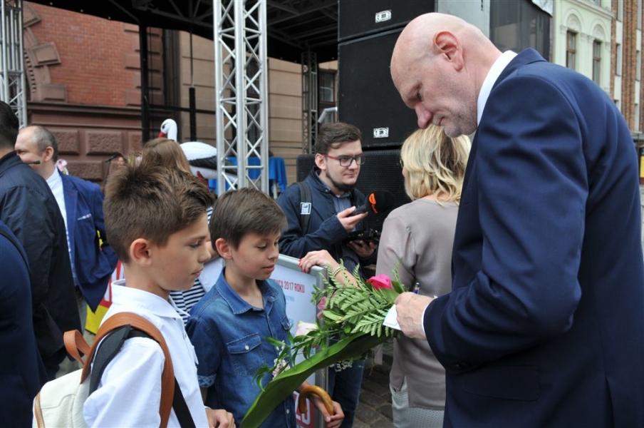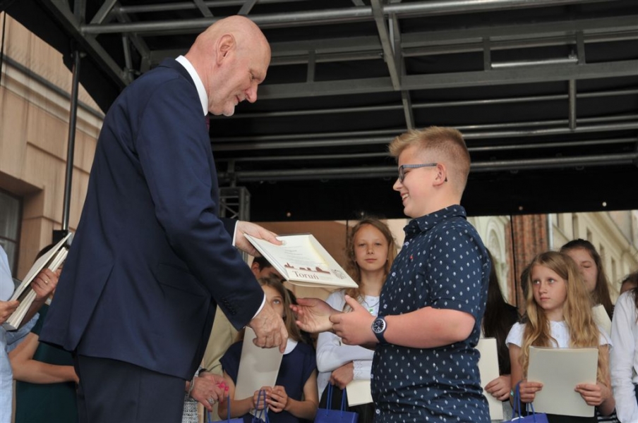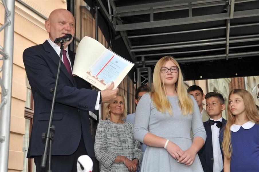 Najlepszą klasą w Toruniu w roku szkolnym 2016/2017 okazała się VI klasa ze Szkoły Podstawowej nr 27 w Kaszczorku. Aż 22 z 25 uczniów otrzymało świadectwo z wyróżnieniem, a średnia ocen klasy to 5,31. W nagrodę prezydent Michał Zaleski 23 czerwca 2017 r. wręczył im świadectwa na Rynku Staromiejskim, podczas Dni Torunia. Fot. Małgorzata Litwin