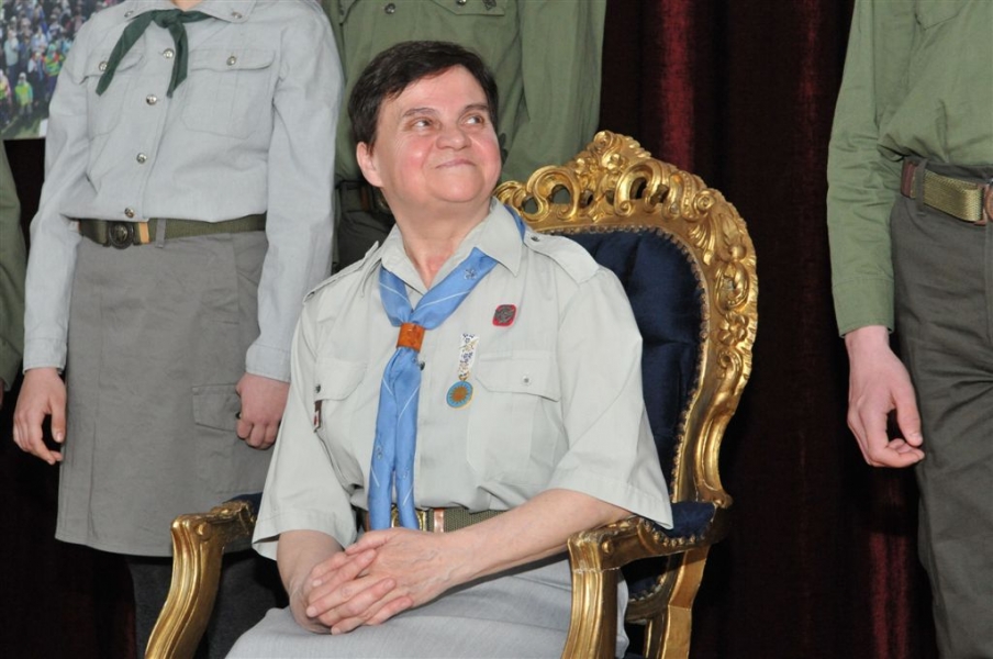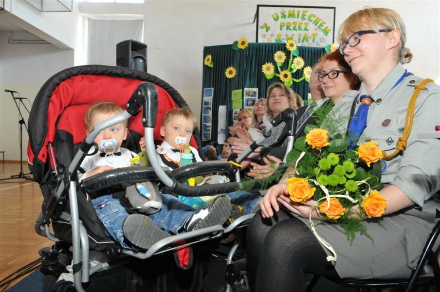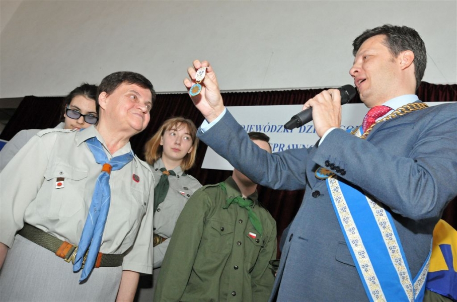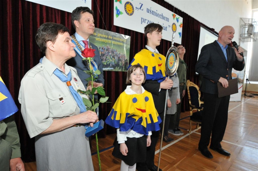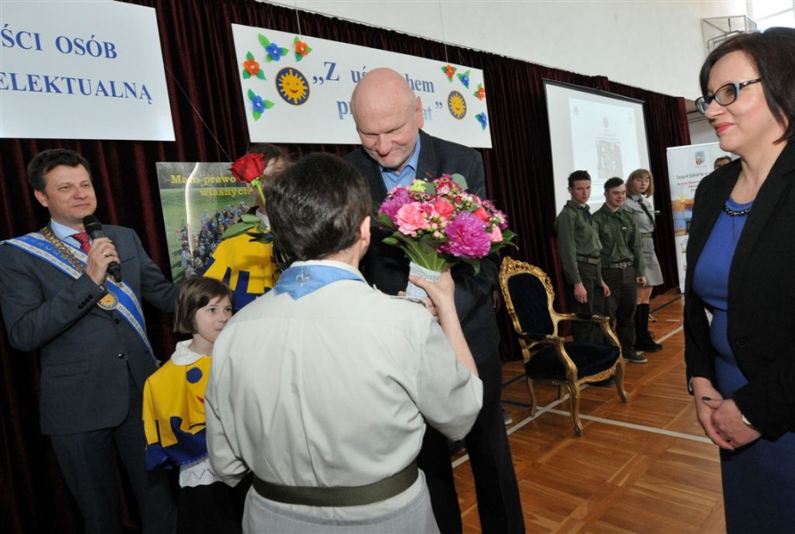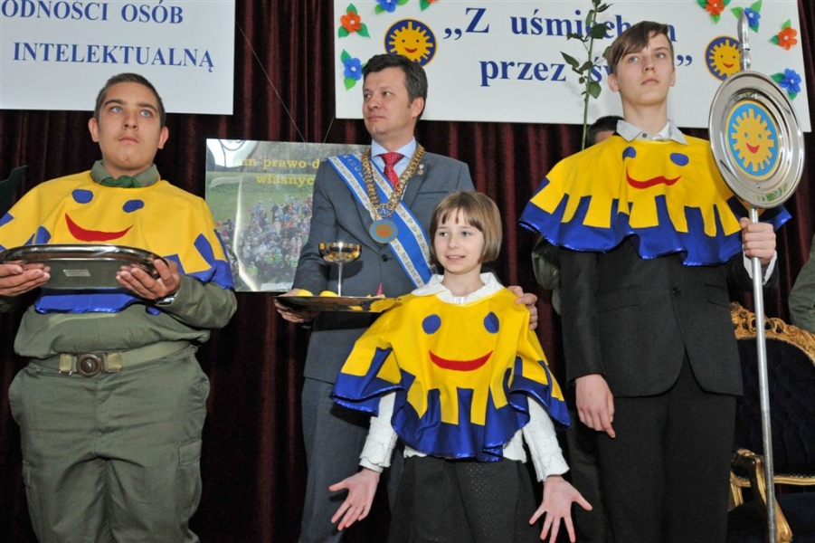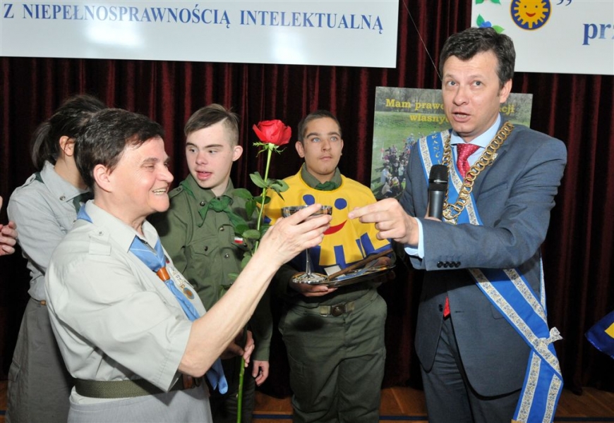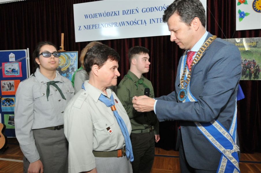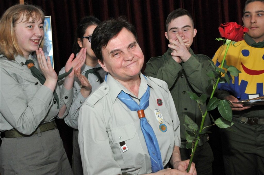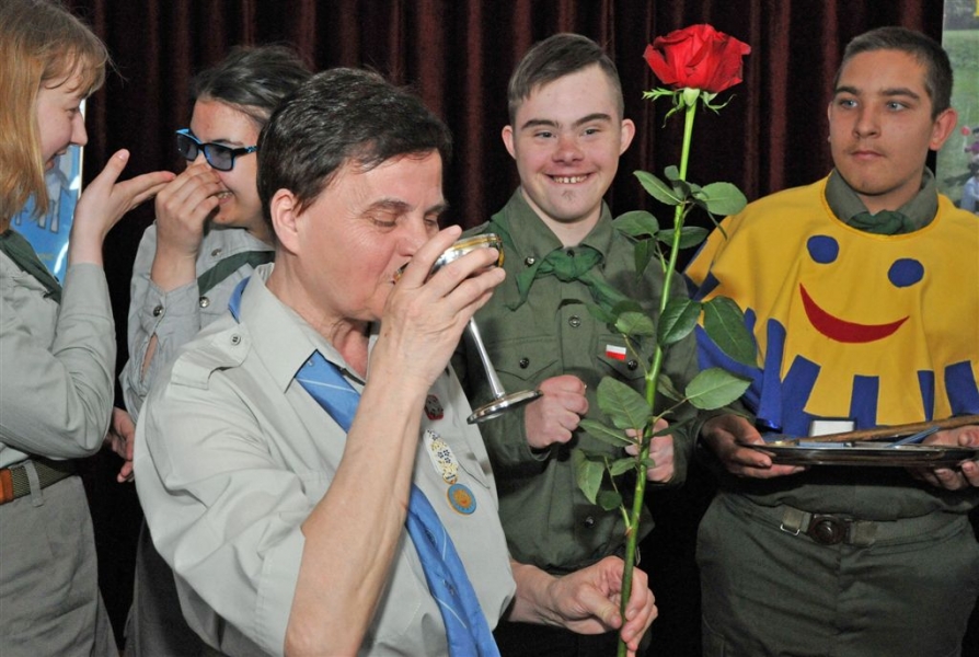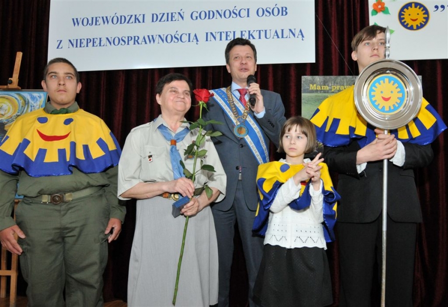 Pani Katarzyna Brożek, emerytowana nauczycielka i wieloletnia wicedyrektor ZS nr 6 w Toruniu, zasłużona w pracy z osobami niepełnosprawnymi i działalności harcerskiej w ruchu Nieprzetartego Szlaku otrzymała Order Uśmiechu. Odznaczenie zostało jej wręczone 5 maja 2016 r. podczas obchodów Europejskiego Dnia Godności Osób z Niepełnosprawnością Intelektualną. Na Kawalera pasował ją Marek Michalak, Kanclerz Międzynarodowej Kapituły Orderu Uśmiechu i jednocześnie Rzecznik Praw Dziecka. Gościem uroczystości był prezydent Torunia Michał Zaleski, który pogratulował laureatce orderu tak znamienitego wyróżnienia, przynoszącego chlubę całemu Toruniowi. Fot. Małgorzata Litwin