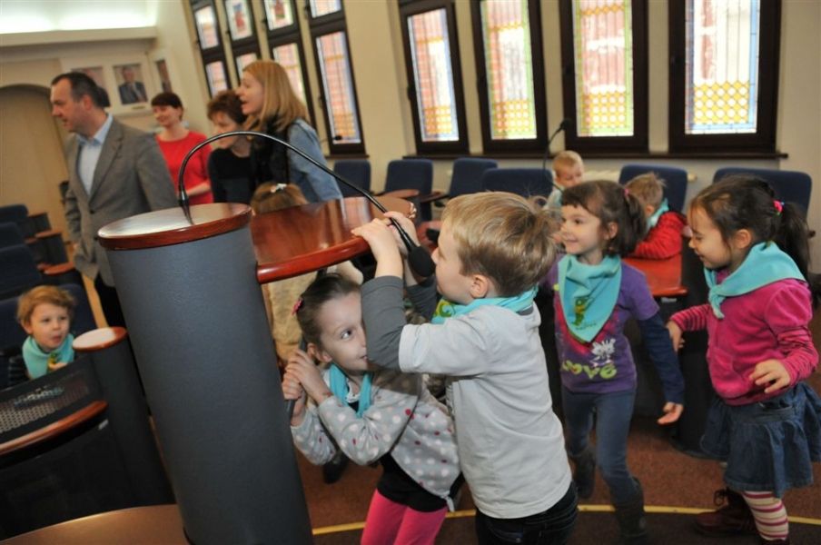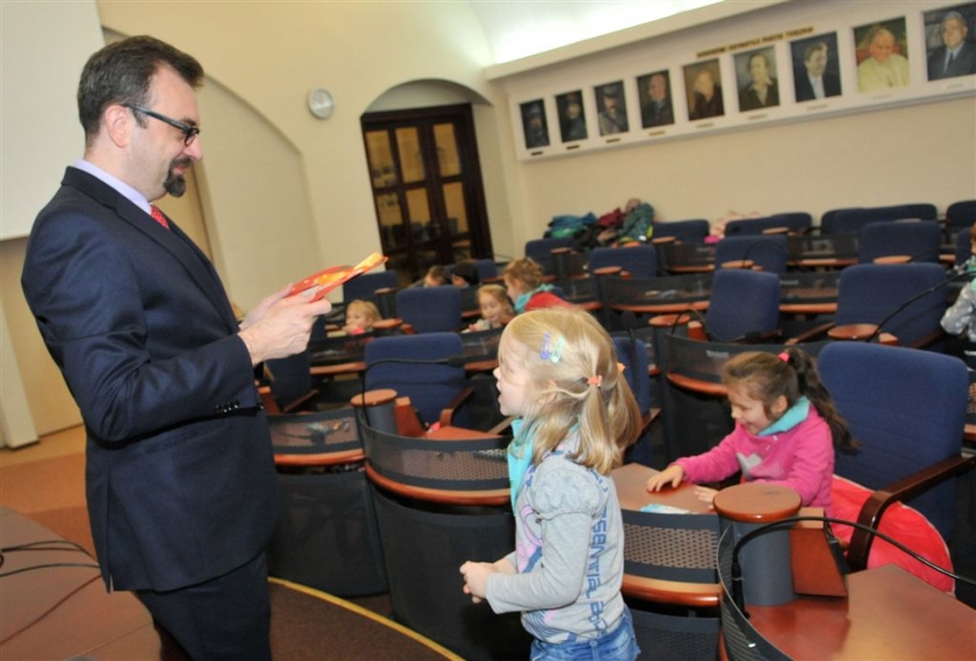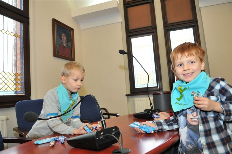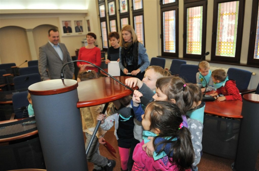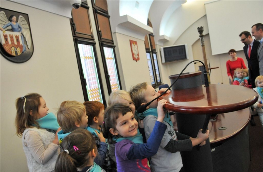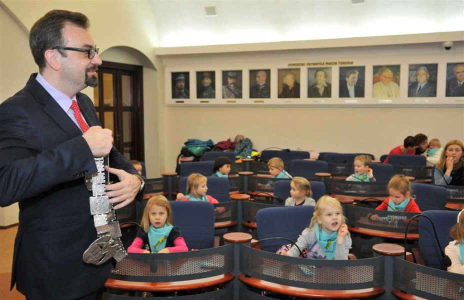 4 listopada 2015 r. w Urzędzie Miasta Torunia gościła grupa dzieci z Przedszkola Niepublicznego "Raczek" w Toruniu. Maluchy miały okazję zasiąść w fotelach radnych Rady Miasta Torunia i dowiedzieć się od przewodniczącego rady Marcina Czyżniewskiego, jakie są symbole naszego miasta, czym się zajmują radni i prezydent oraz jak zostać Honorowym Obywatelem Torunia. Fot. Małgorzata Litwin