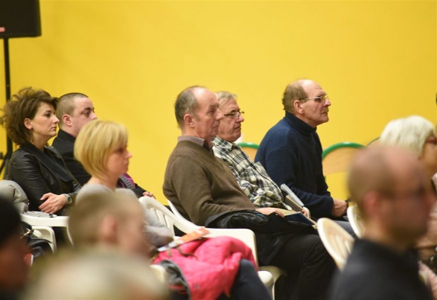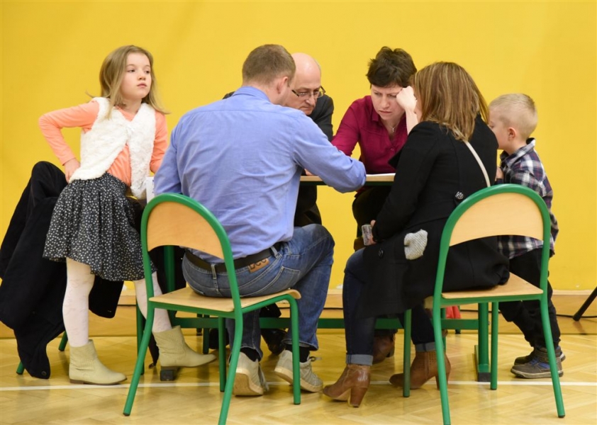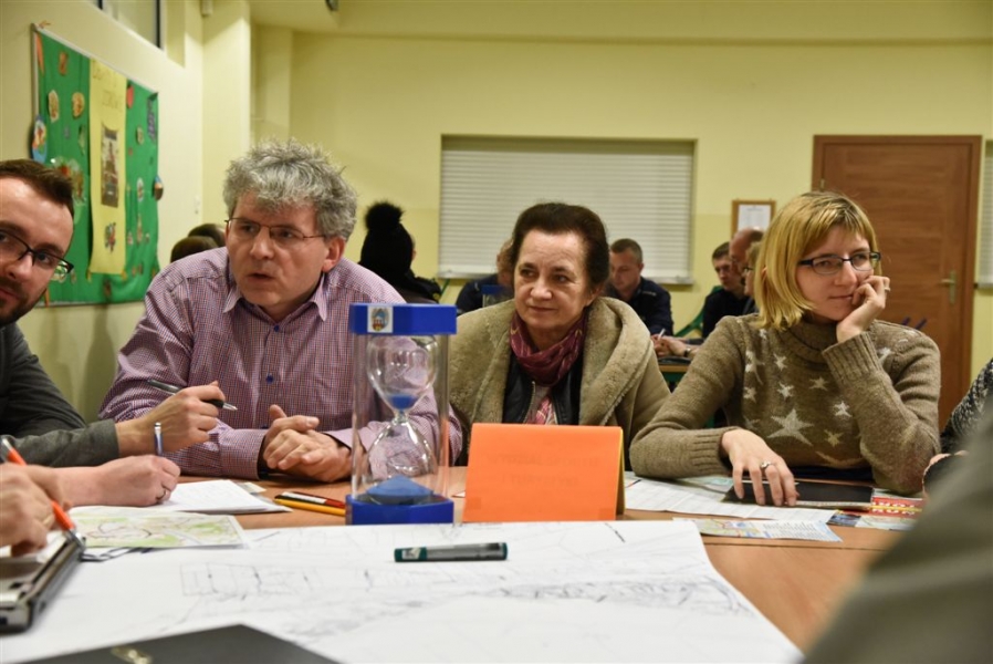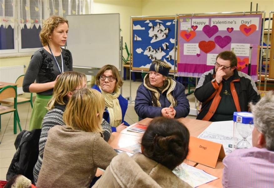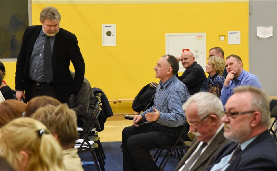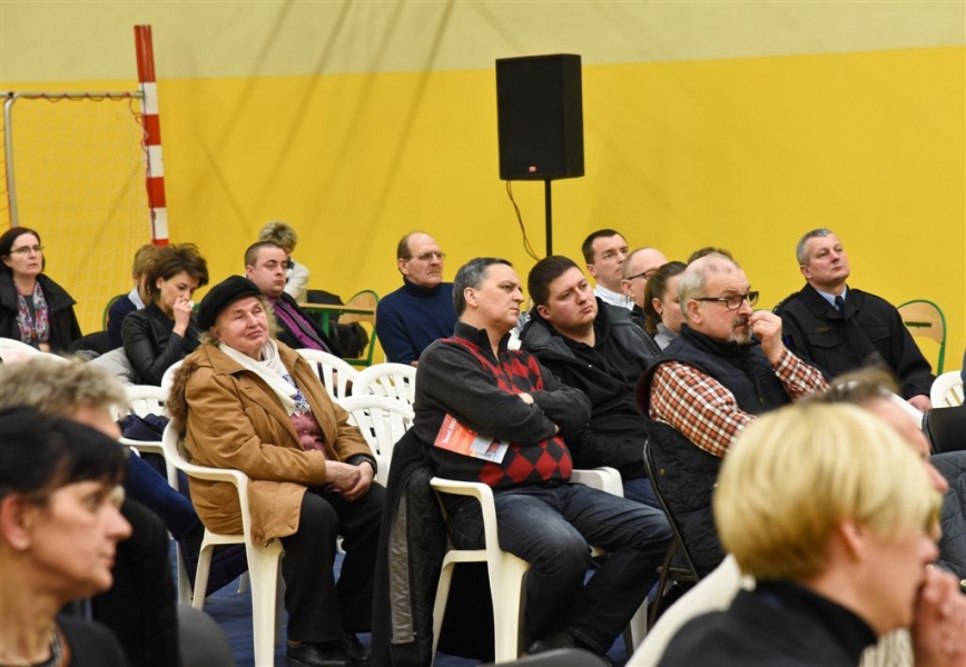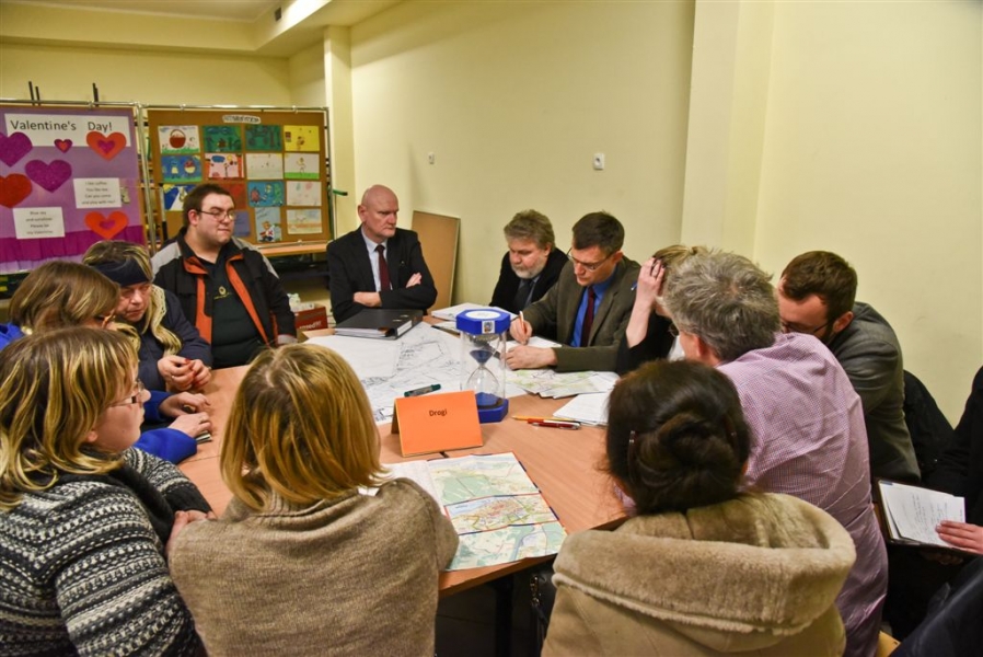 Trwa cykl dyskusji o mieście prezydenta Torunia Michała Zaleskiego z mieszkańcami wszystkich trzynastu okręgów miasta. 18 lutego 2016 r. odbyło się spotkanie na Podgórzu. Nowością są w tym roku warsztaty stolikowe przed spotkaniem głównym, na których mieszkańcy mają okazję bezpośrednio porozmawiać z prezydentem o problemach osiedlowych. Fot. Lech Kamiński