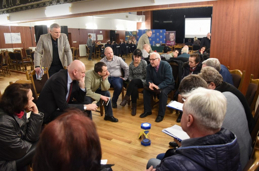 Trwa cykl dyskusji o mieście prezydenta Torunia Michała Zaleskiego z mieszkańcami wszystkich trzynastu okręgów miasta. 22 lutego 2016 r. odbyło się spotkanie na Rudaku. Nowością są w tym roku warsztaty stolikowe przed spotkaniem głównym, na których mieszkańcy mają okazję bezpośrednio porozmawiać z prezydentem o problemach osiedlowych. Fot. Lech Kamiński