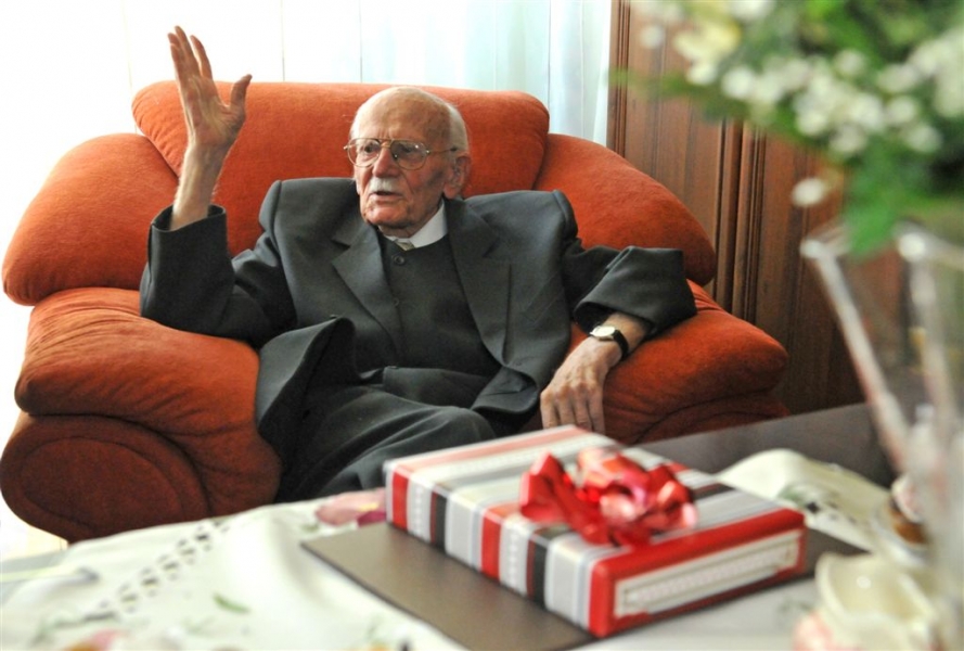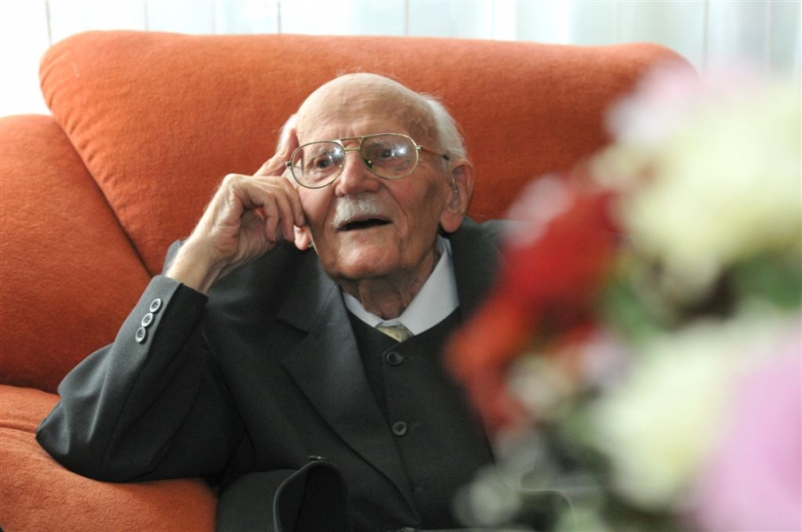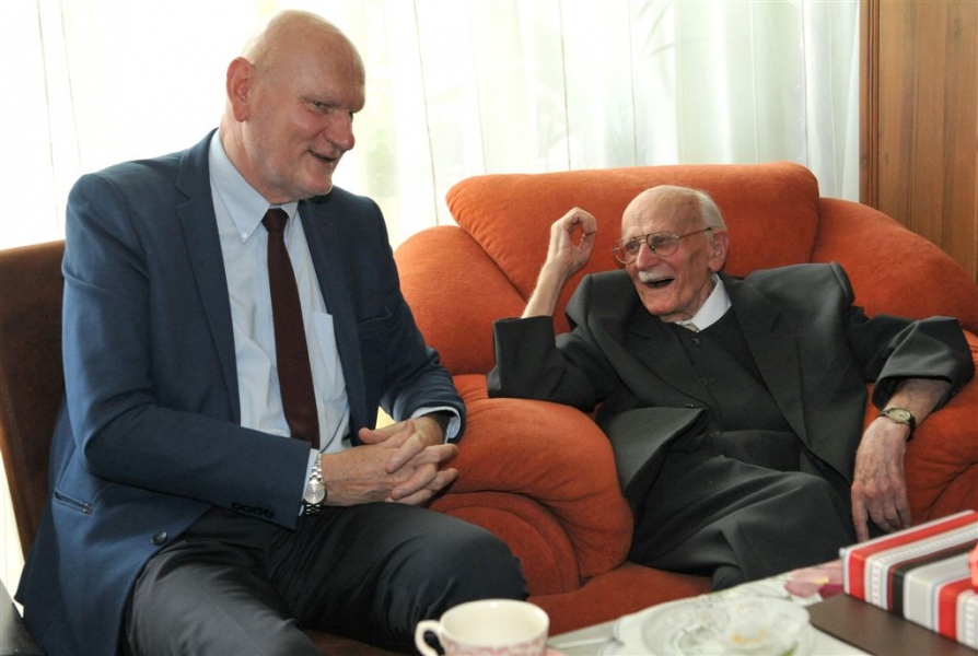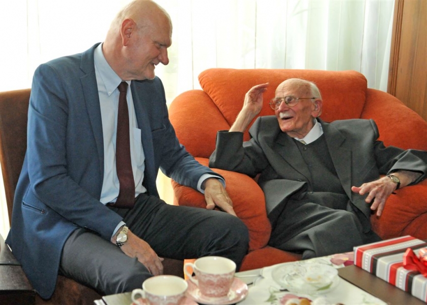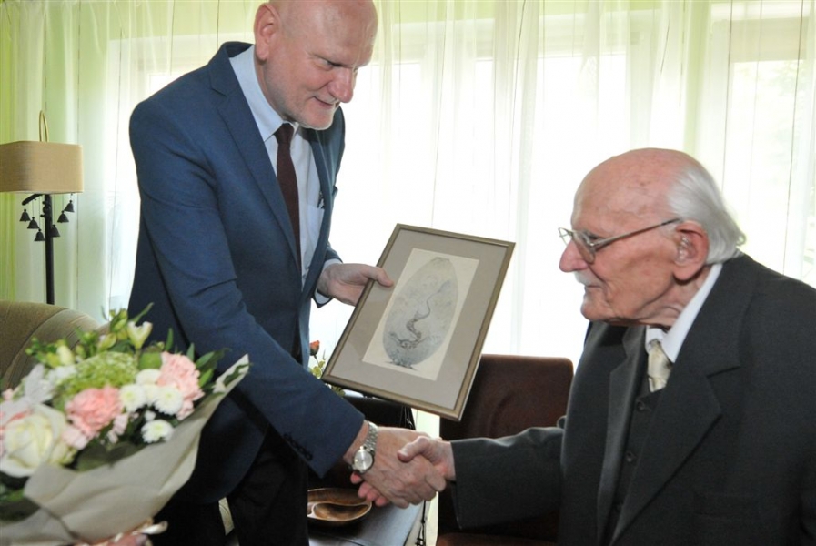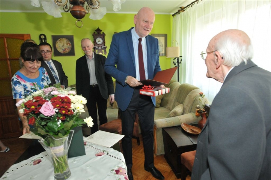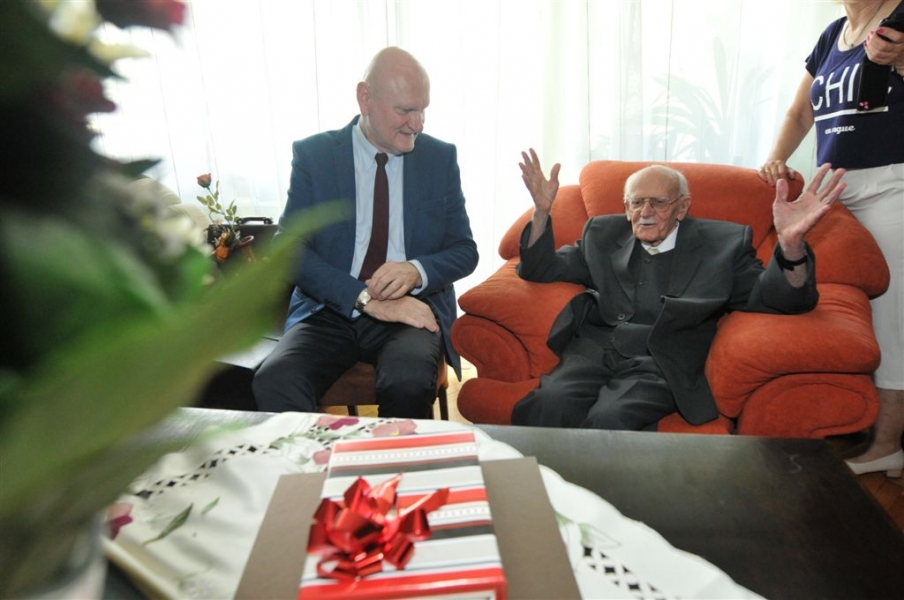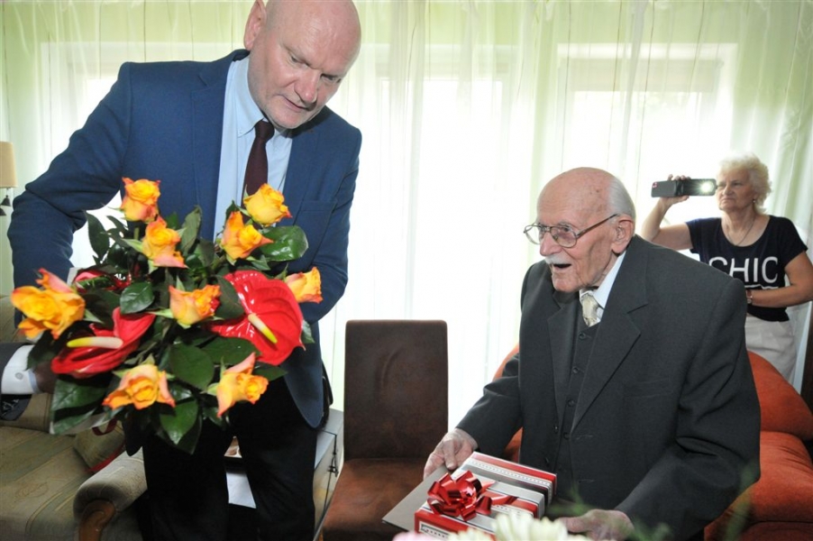 Sto lat skończył w niedzielę, 25 czerwca 2017 roku pan Mieczysław Cymerski. Z tej okazji 27 czerwca jubilata odwiedzili z prezentem, listem gratulacyjnym i kwiatami prezydent Torunia Michał Zaleski i Ewa Orłowska z Urzędu Stanu Cywilnego. Fot. Małgorzata Litwin