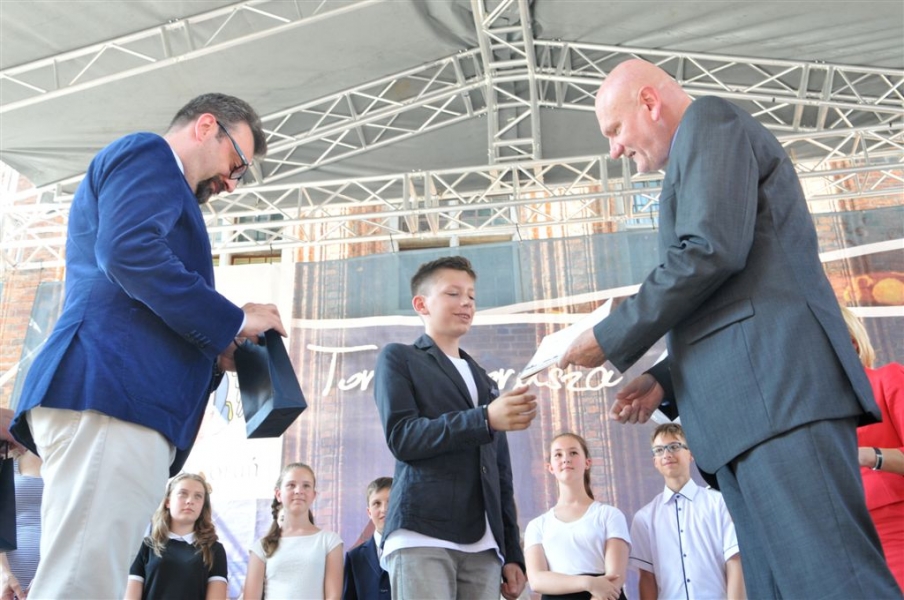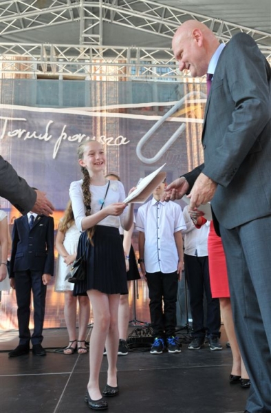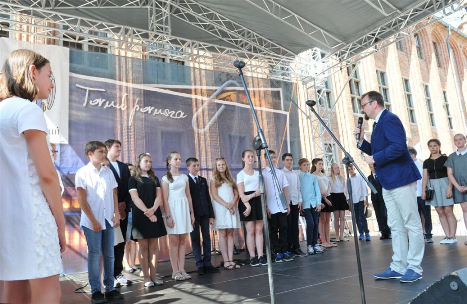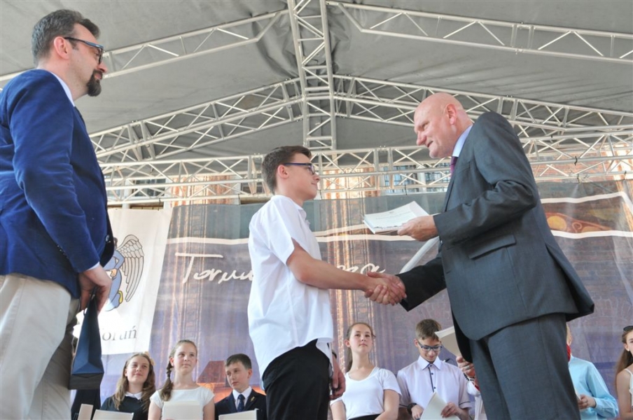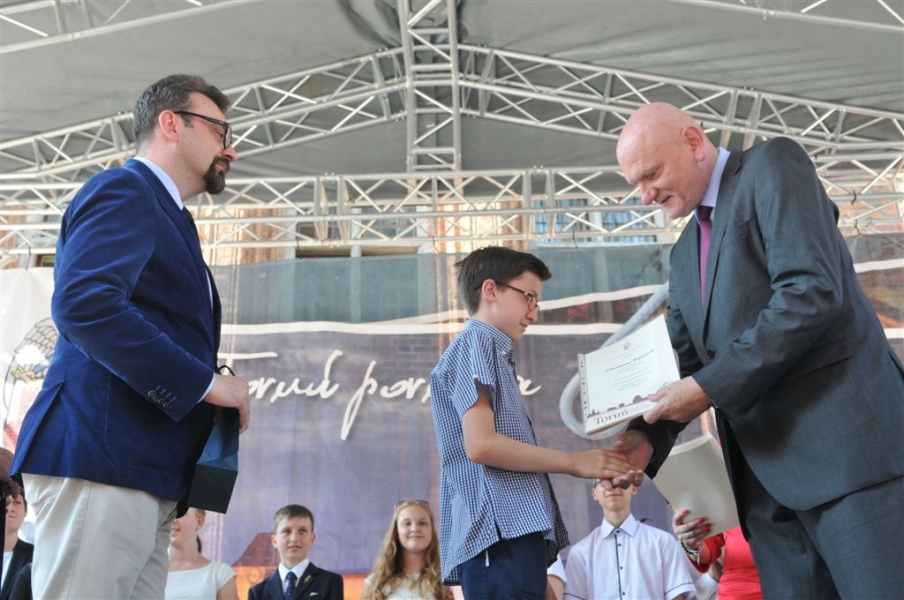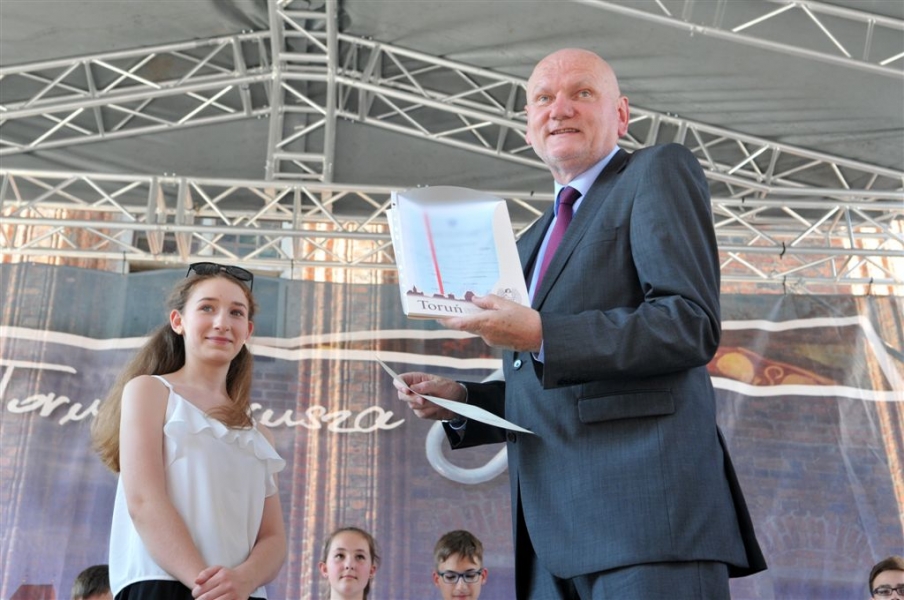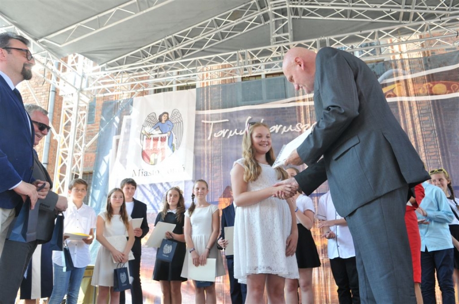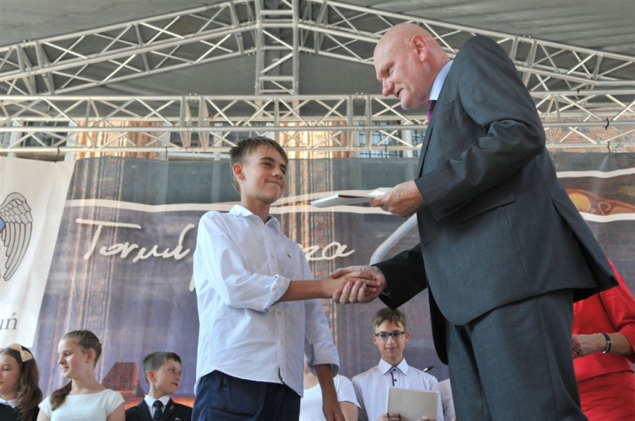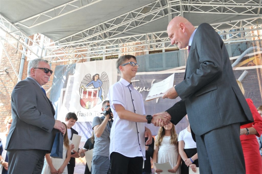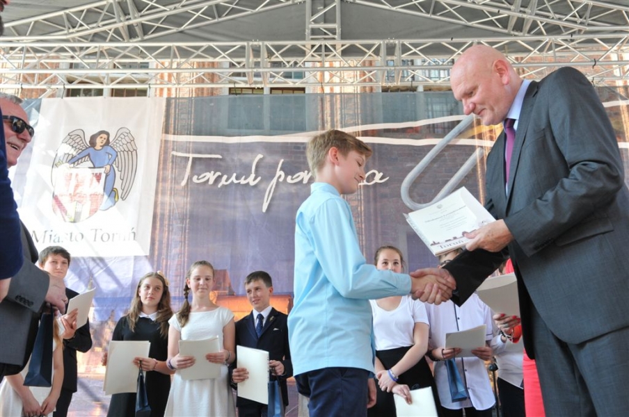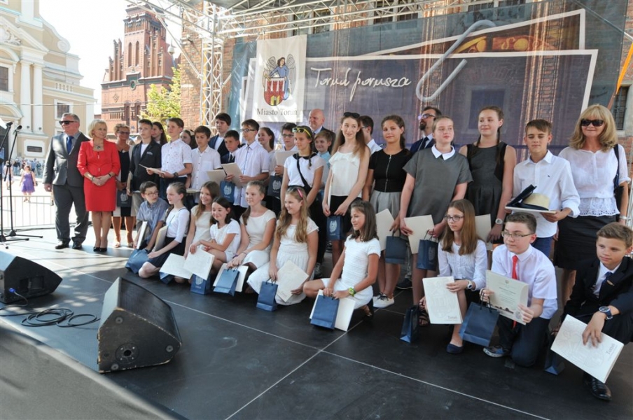 Tradycyjnie w dniu Święta Miasta, 24 czerwca 2016 r. prezedent wręczył na Rynku Staromiejskim świadectwa toruńskiej klasie, która wyróżniła się w nauce w minionym roku szkolnym. W tym roku jest to VIa ze Szkoły Podstawowej nr 24, która uzyskała najwyższy w Toruniu wynik ze sprawdzianu dla klas szóstych w roku 2016. Aż dwudziestu jej uczniów ma średnią ocen powyżej 5, a jedna osoba nawet 6. Odnoszą sukcesy sportowe, są laureatami konkursów, udzielają się społecznie. Wychowawcą klasy jest pani Anna Standish. Fot. Małgorzata Litwin