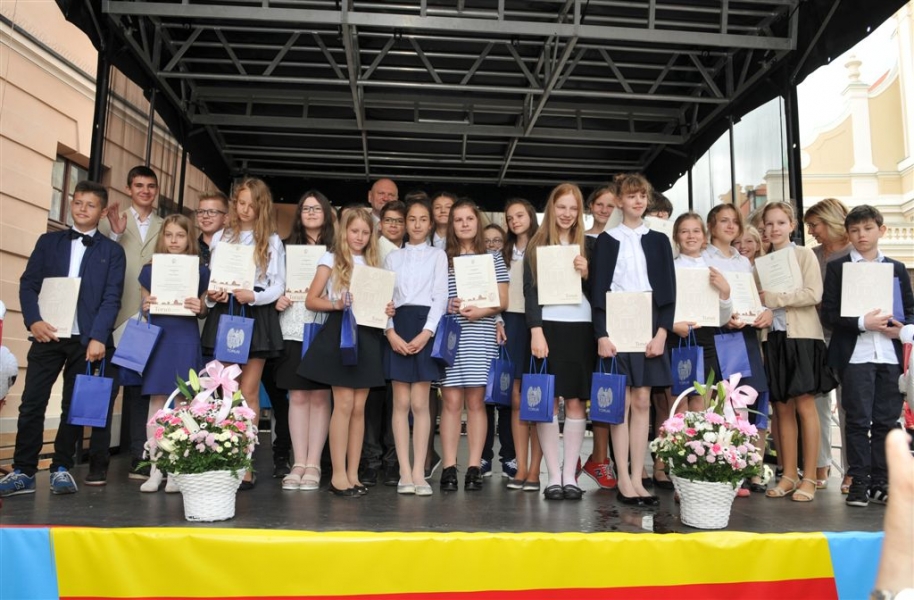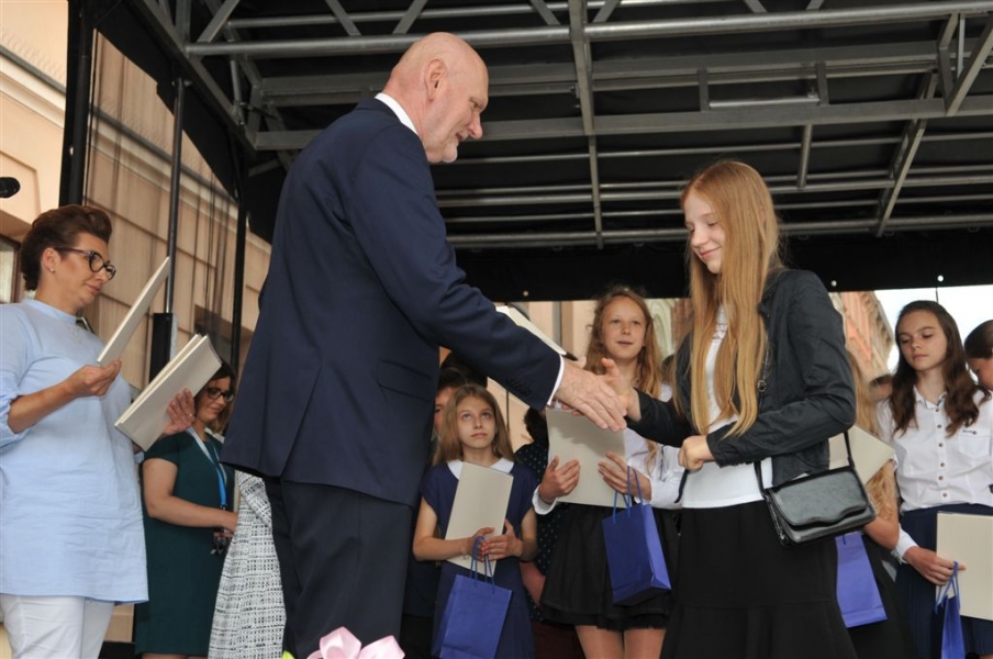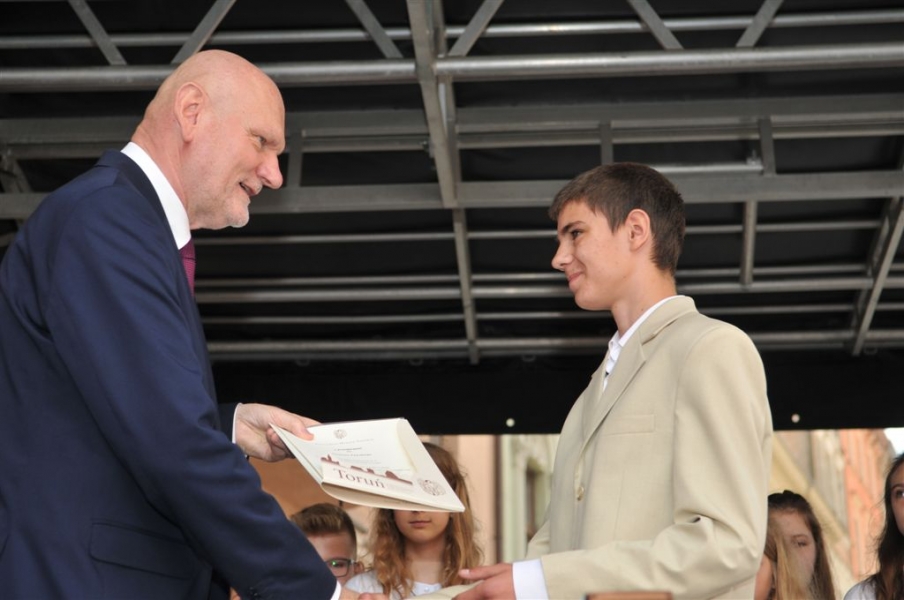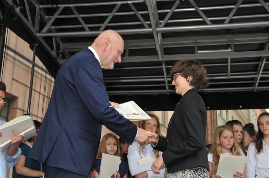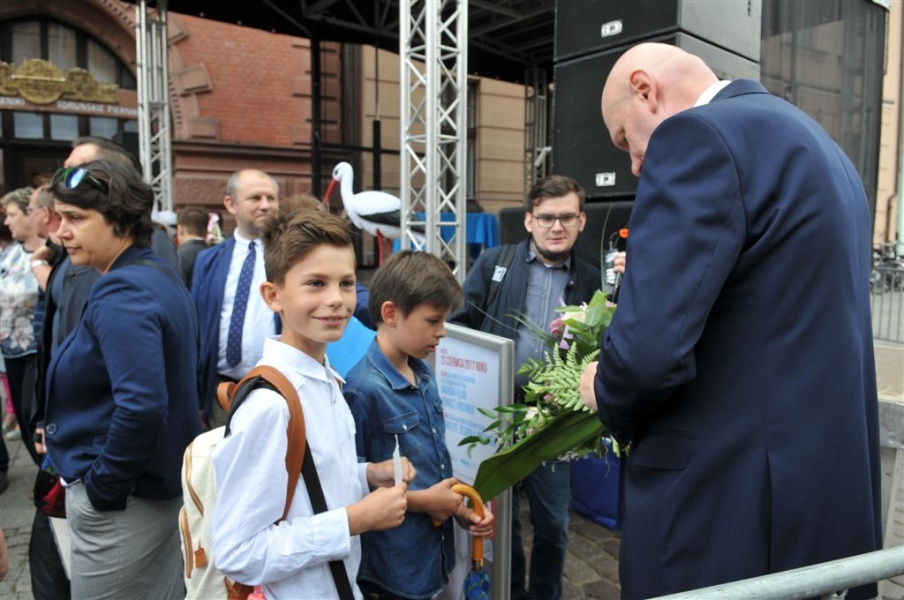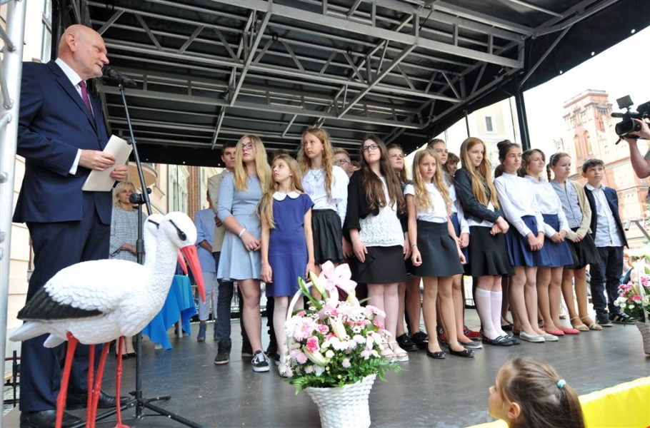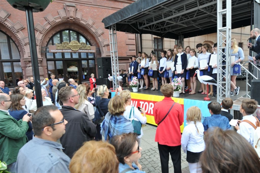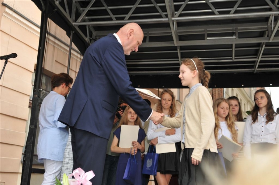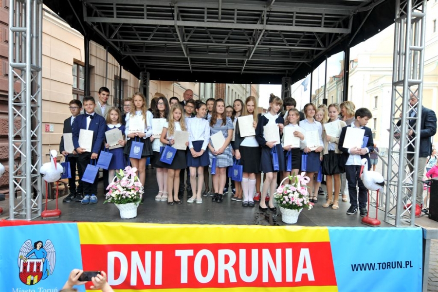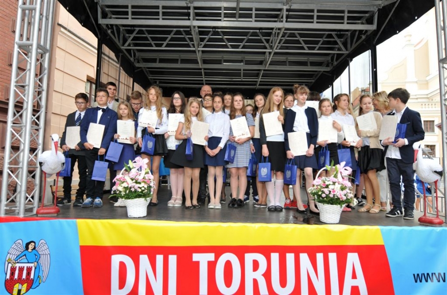 Najlepszą klasą w Toruniu w roku szkolnym 2016/2017 okazała się VI klasa ze Szkoły Podstawowej nr 27 w Kaszczorku. Aż 22 z 25 uczniów otrzymało świadectwo z wyróżnieniem, a średnia ocen klasy to 5,31. W nagrodę prezydent Michał Zaleski 23 czerwca 2017 r. wręczył im świadectwa na Rynku Staromiejskim, podczas Dni Torunia. Fot. Małgorzata Litwin