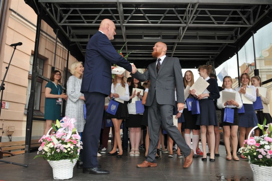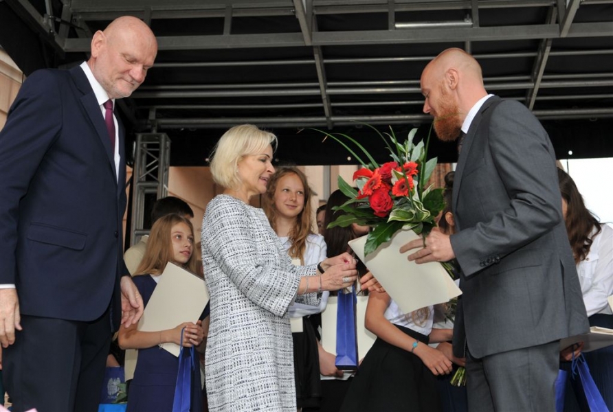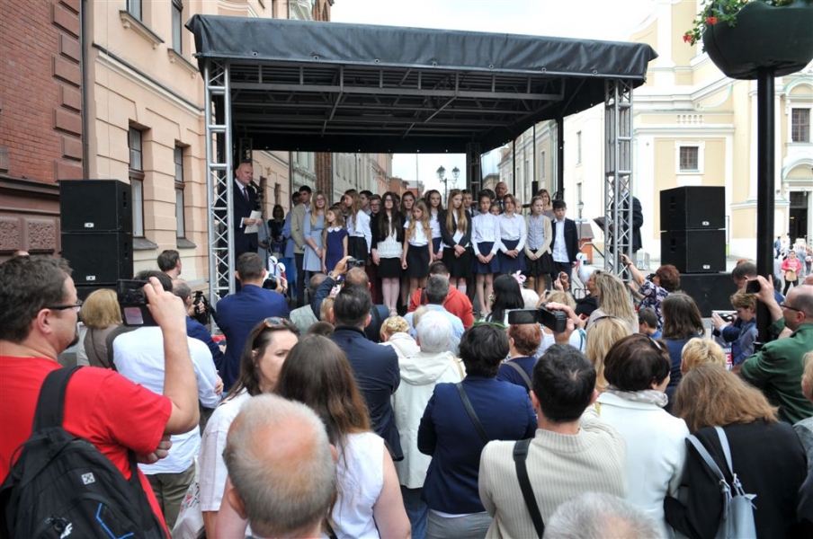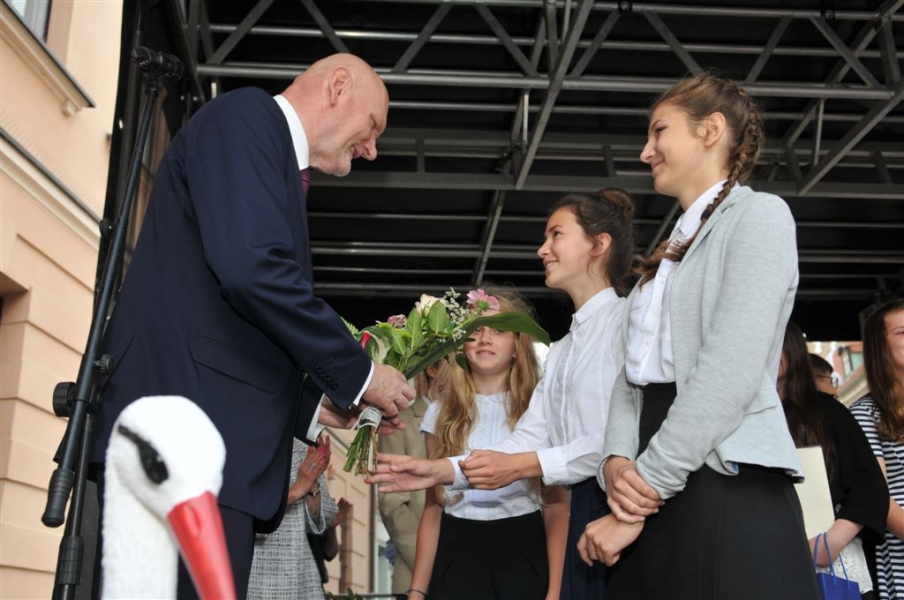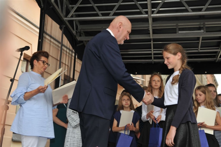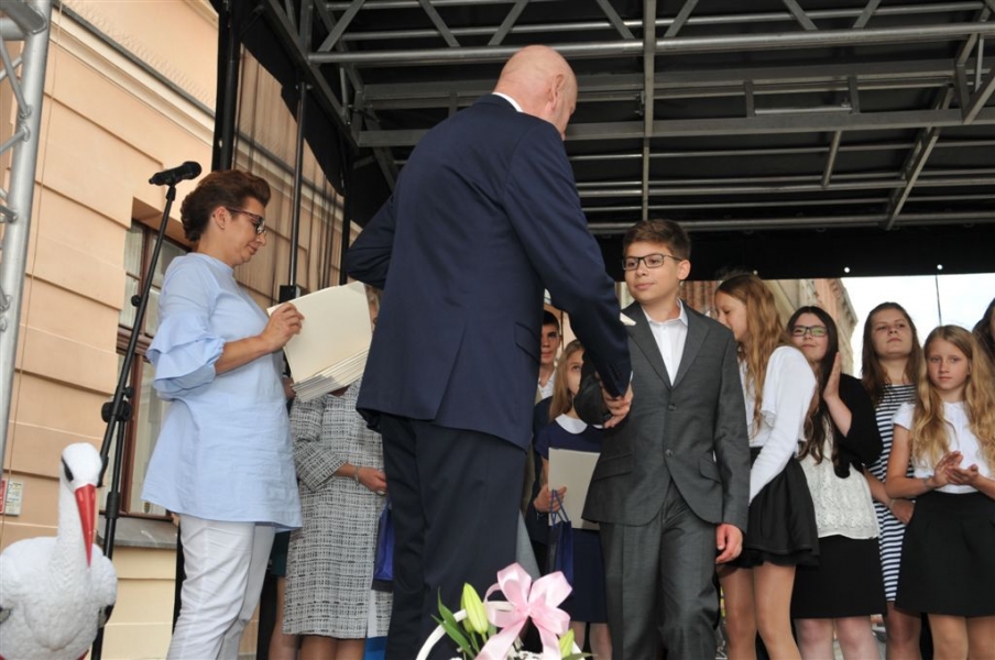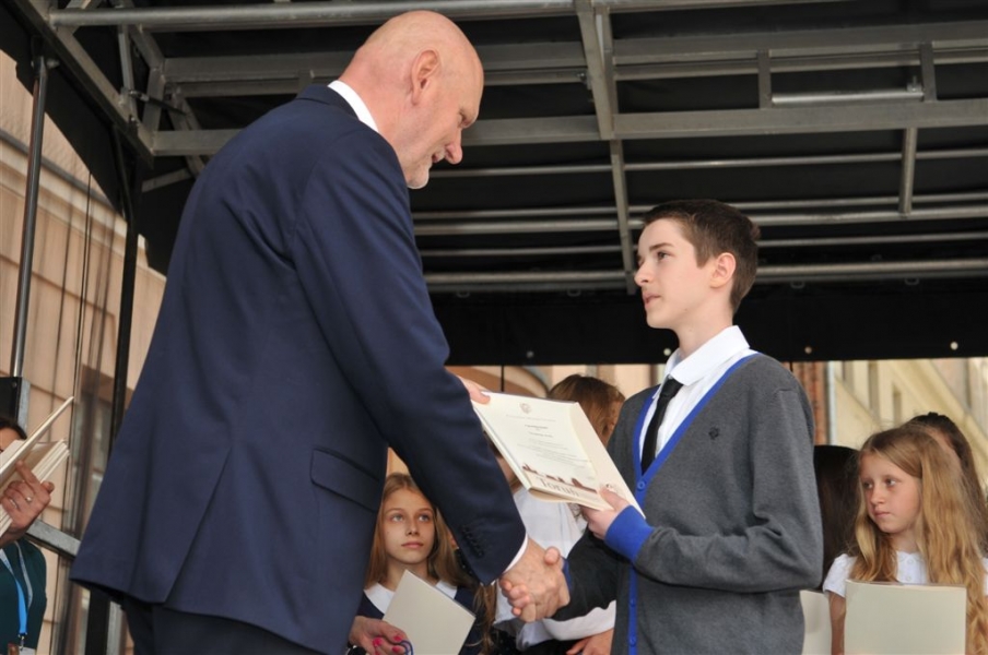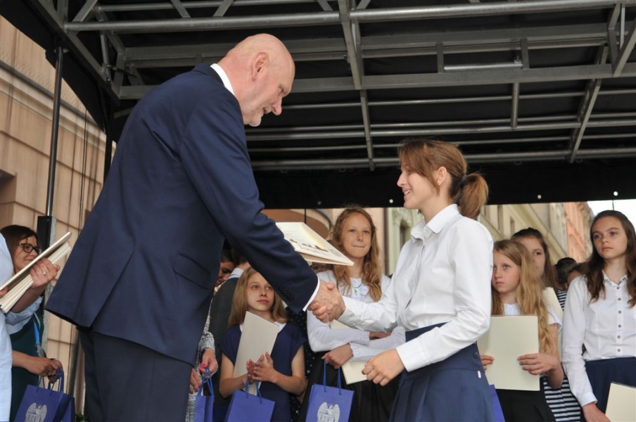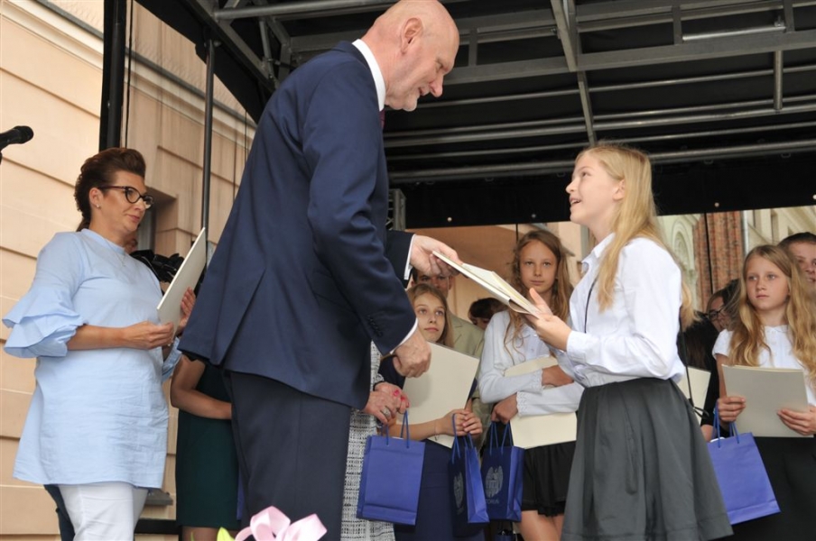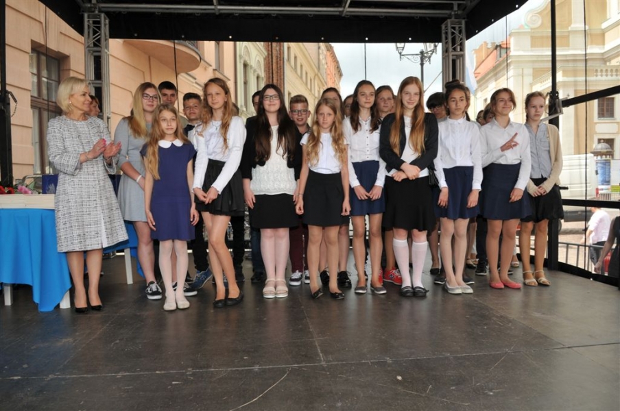 Najlepszą klasą w Toruniu w roku szkolnym 2016/2017 okazała się VI klasa ze Szkoły Podstawowej nr 27 w Kaszczorku. Aż 22 z 25 uczniów otrzymało świadectwo z wyróżnieniem, a średnia ocen klasy to 5,31. W nagrodę prezydent Michał Zaleski 23 czerwca 2017 r. wręczył im świadectwa na Rynku Staromiejskim, podczas Dni Torunia. Fot. Małgorzata Litwin