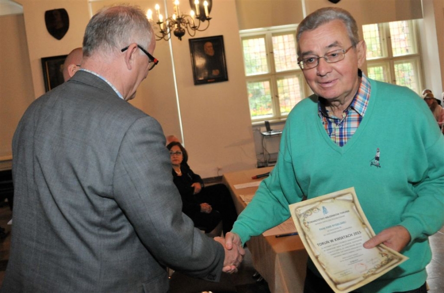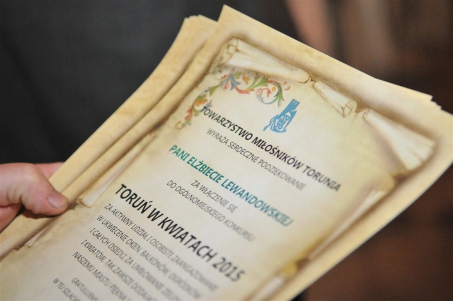 W Ratuszu Staromiejskim 12 października 2015 r. zostały wręczone nagrody i dyplomy w konkursie "Toruń w kwiatach". To toruńska impreza ogrodnicza o kilkudziesięcioletniej tradycji. Nagradzane są w niej okna i balkony oraz ogródki przy budynkach prywatnych, blokach, spółdzielniach, zakładach pracy, instytucjach oraz kościołach. Konkurs, organizowany przez Towarzystwo Miłosników Torunia, odbywa się pod patronatem Prezydenta Miasta Torunia, miasto funduje też nagrody dla jego uczestników. Fot. Małgorzata Litwin