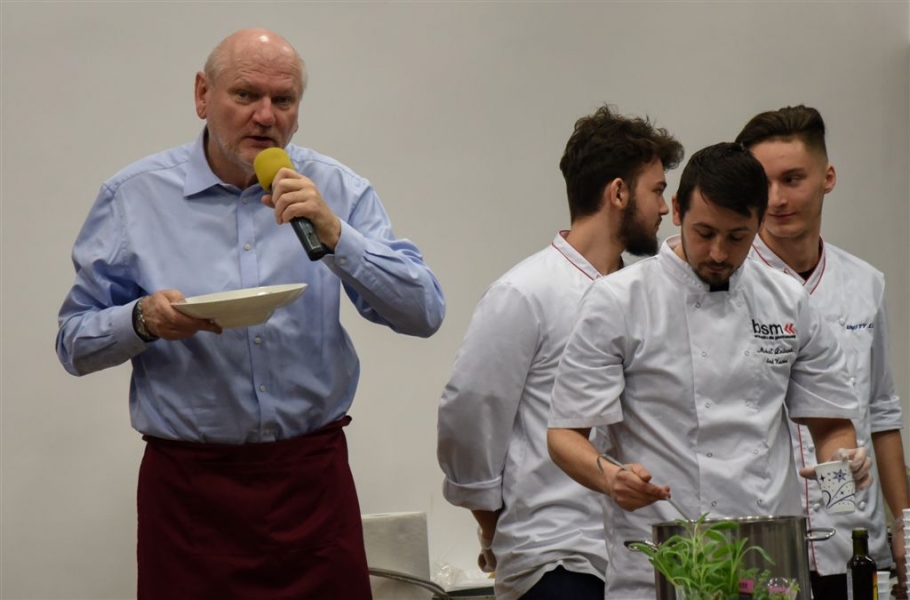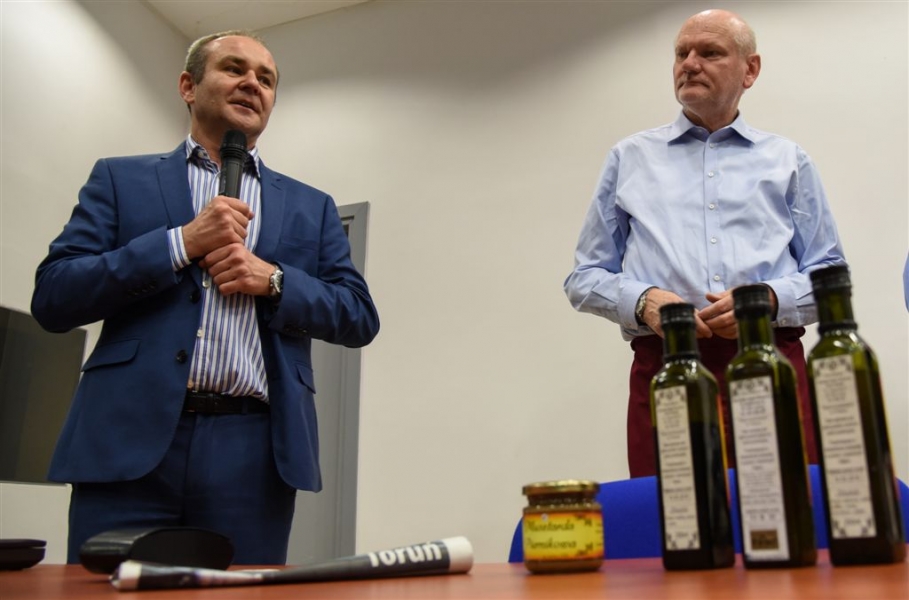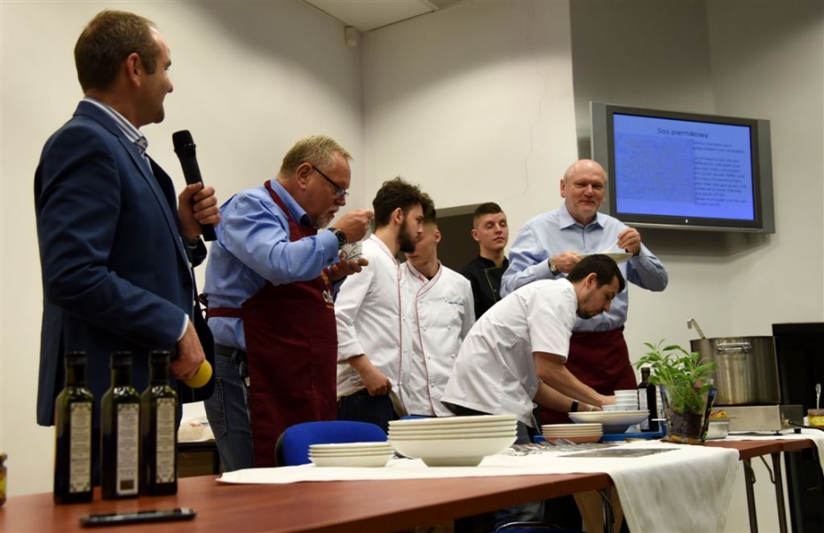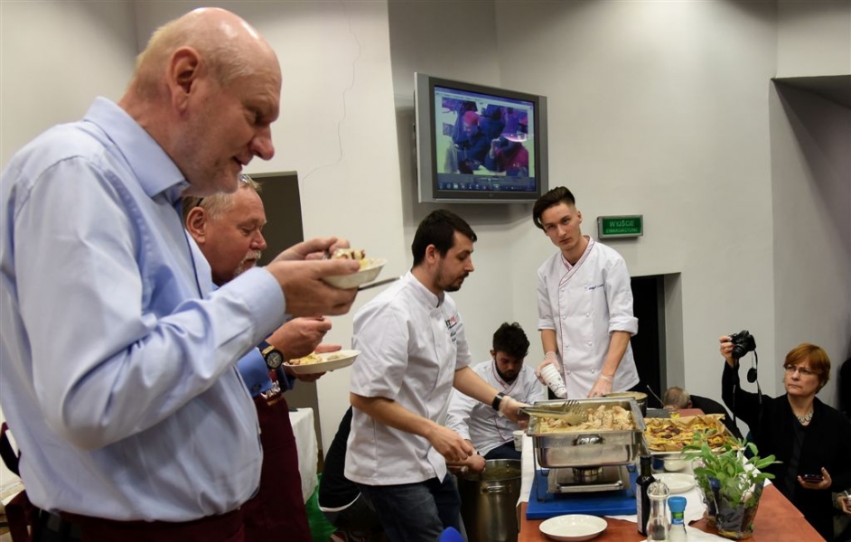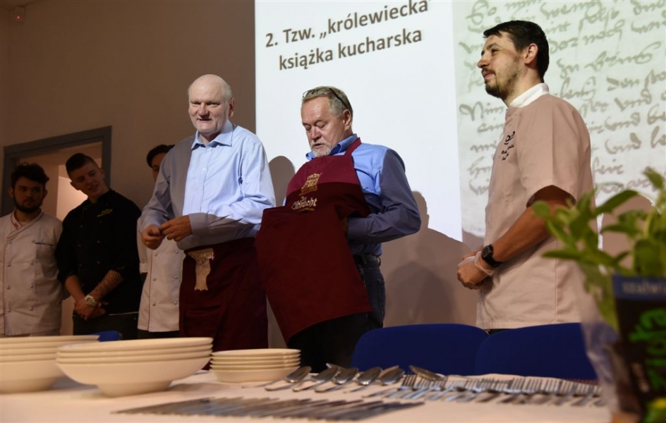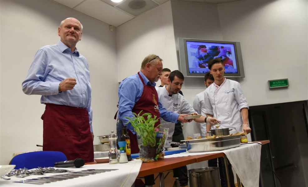 Obiad przygotowany przez prezydenta Torunia i rektora UMK pod okiem profesjonalnych kucharzy był jedną z atrakcji tegorocznego Toruńskiego Festiwalu Smaków, który odbył się 9-10 kwietnia w CT "PARK". Wykłady i degustacje festiwalowe przygotowali prof. Jarosław Dumanowski, grupa "Kuchenne rekonstrukcje", studenci, doktoranci i absolwenci Centrum Dziedzictwa Kulinarnego UMK na Wydziale Nauk Historycznych UMK. Tematem tegorocznej edycji była kuchnia krzyżacka. Fot. Lech Kamiński